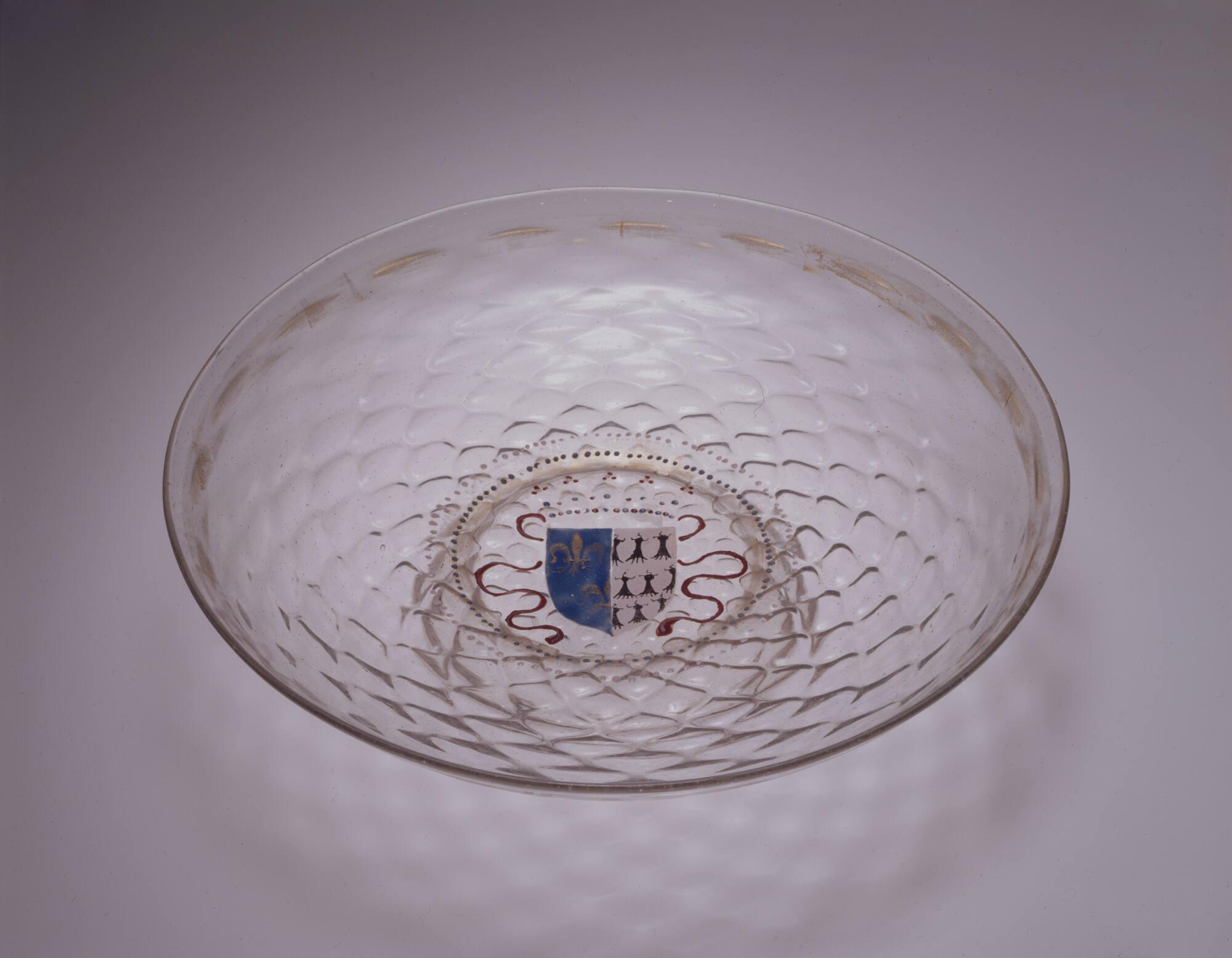 Label TextThe armorial shield on this footed plate combines the coat-of-arms of Anne, duchess of Brittany (1477–1514) with those of Louis XII of France (ruled 1498–1515). It was probably part of a service made in celebration of their marriage in 1499. Used at the French court, it would have reinforced the importance of the newly formed dynastic connection. Venetian glassware was imported into France in the 15th century, but technical evidence of the vessels from this service suggests that French manufacturers reproduced the Venetian style.Published ReferencesSpitzer Collection Catalogue, Vol. III, 1891, p. 101, no. 58.
