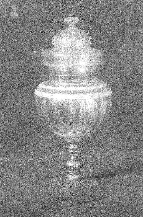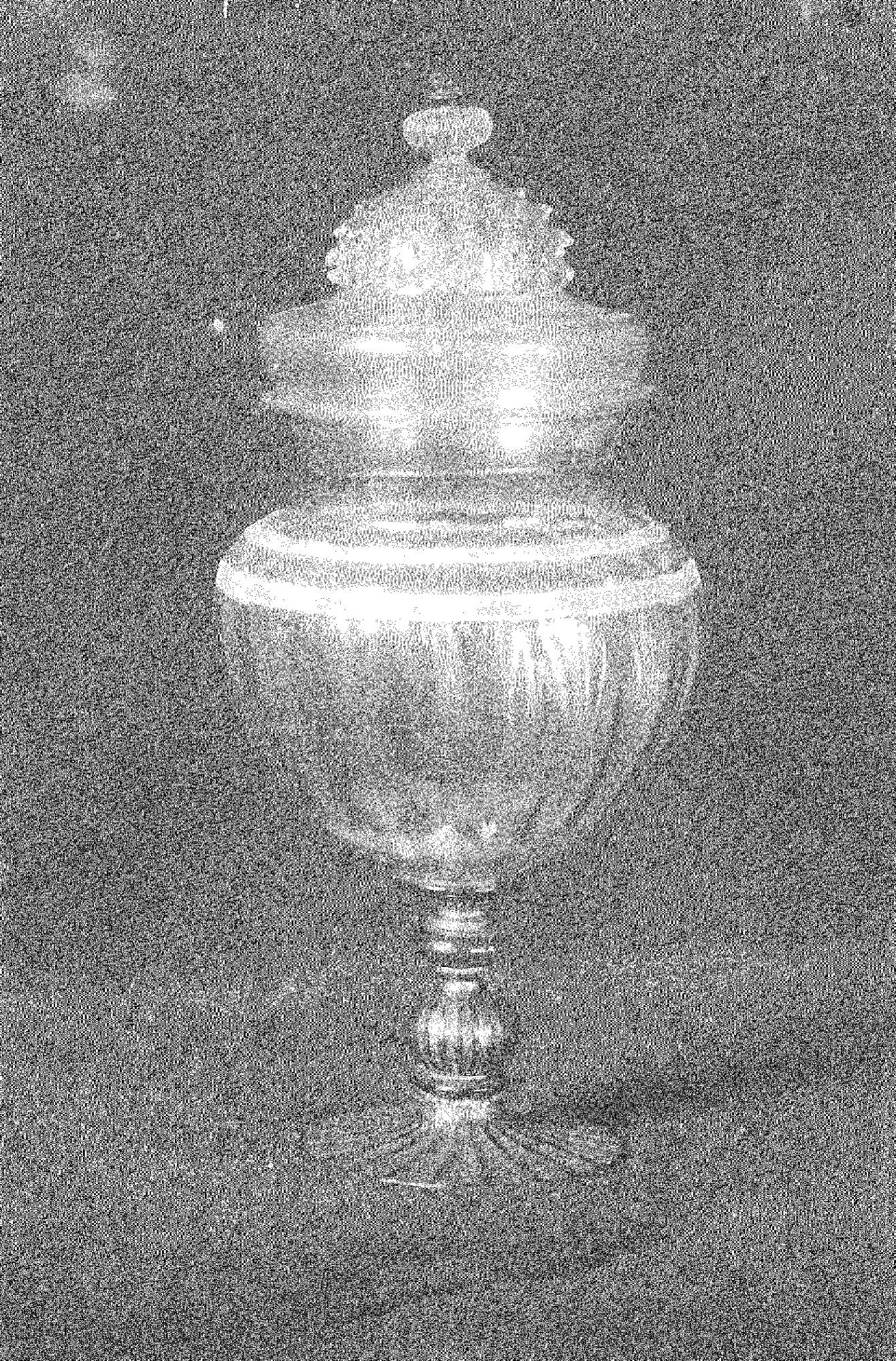 DescriptionMold-blown. Clear glass; body has two bands opaque filigree pattern, fluted below. Cover has raised knobs of glass all over, and blue finial.