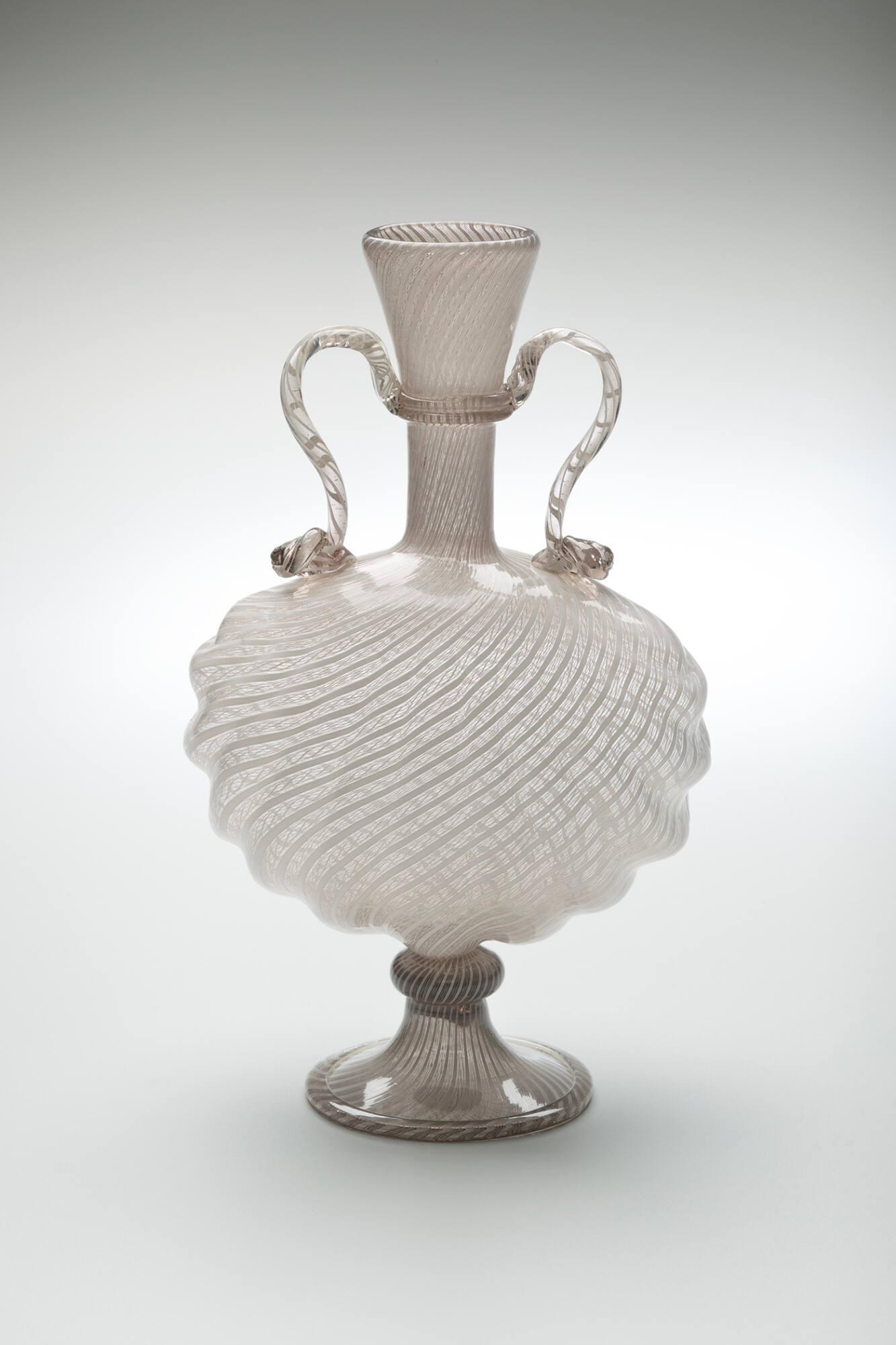Latticinio glass in diagonal stripe and filigree pattern. Flattened globular body, fluted, with tall neck and low flaring base. Two handles joining neck to body.