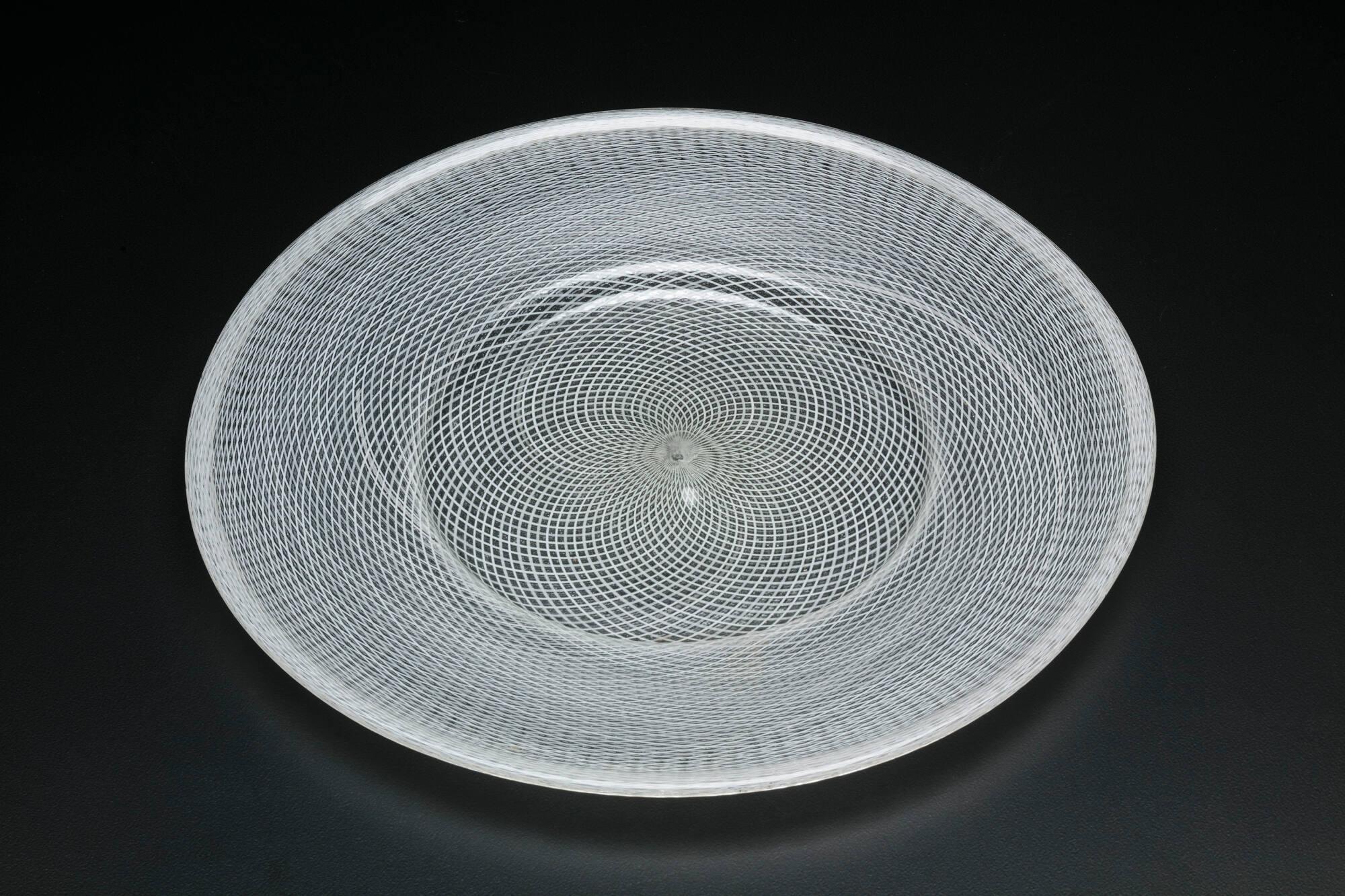 Label TextThis large plate was created by fusing two glass bubbles with twisted glass canes, forming a delicate network pattern (vetro a retorti).Published ReferencesHutton, William, "European Glass in the Museum Collection," Toledo Museum News, New Series, vol. 6, no. 1, Spring 1963 (also published as European Glass), p. 7, repr.