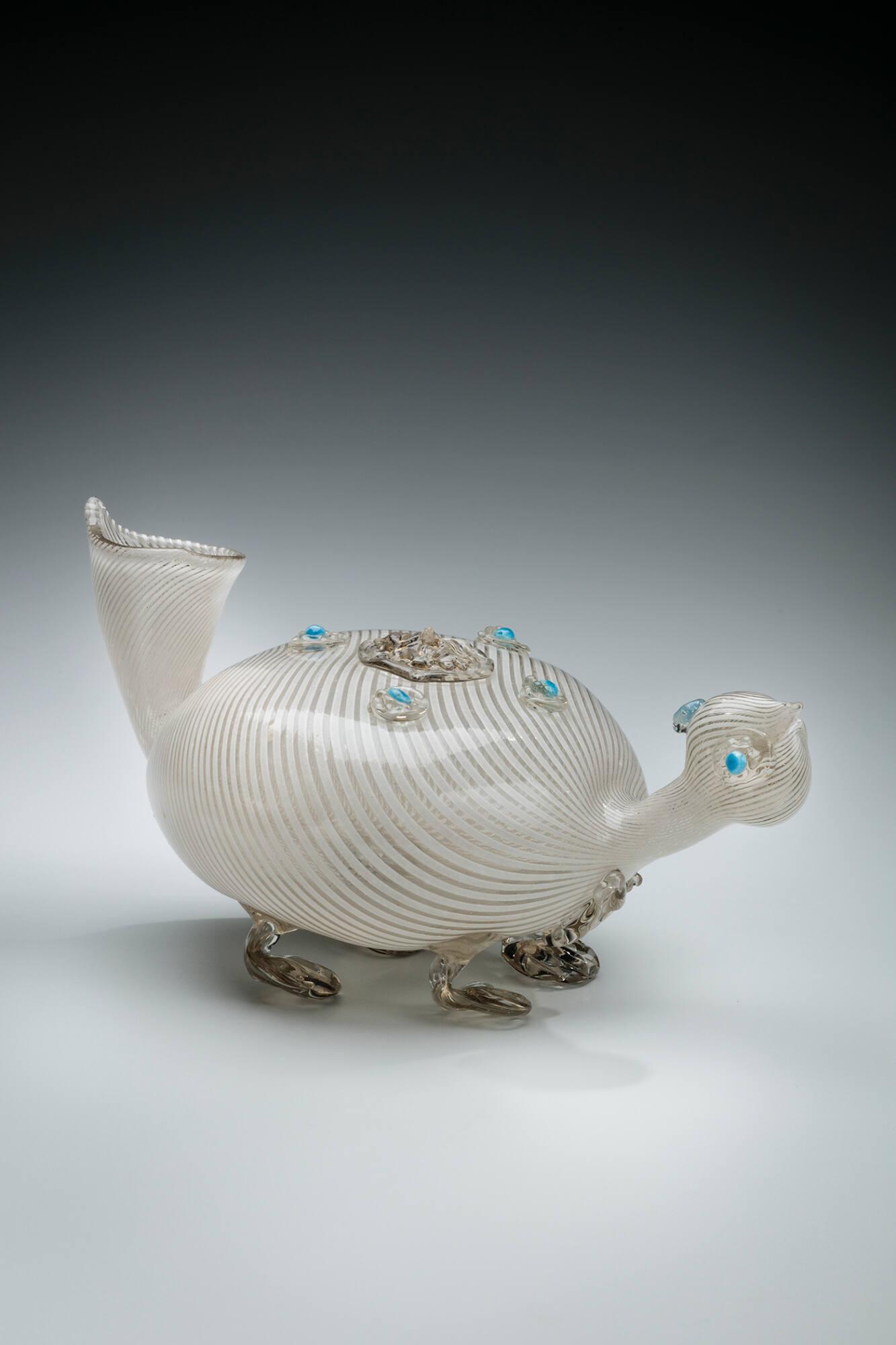 DescriptionBlown and tooled glass, with filigrana decoration, applied feet and decoration, gilded.