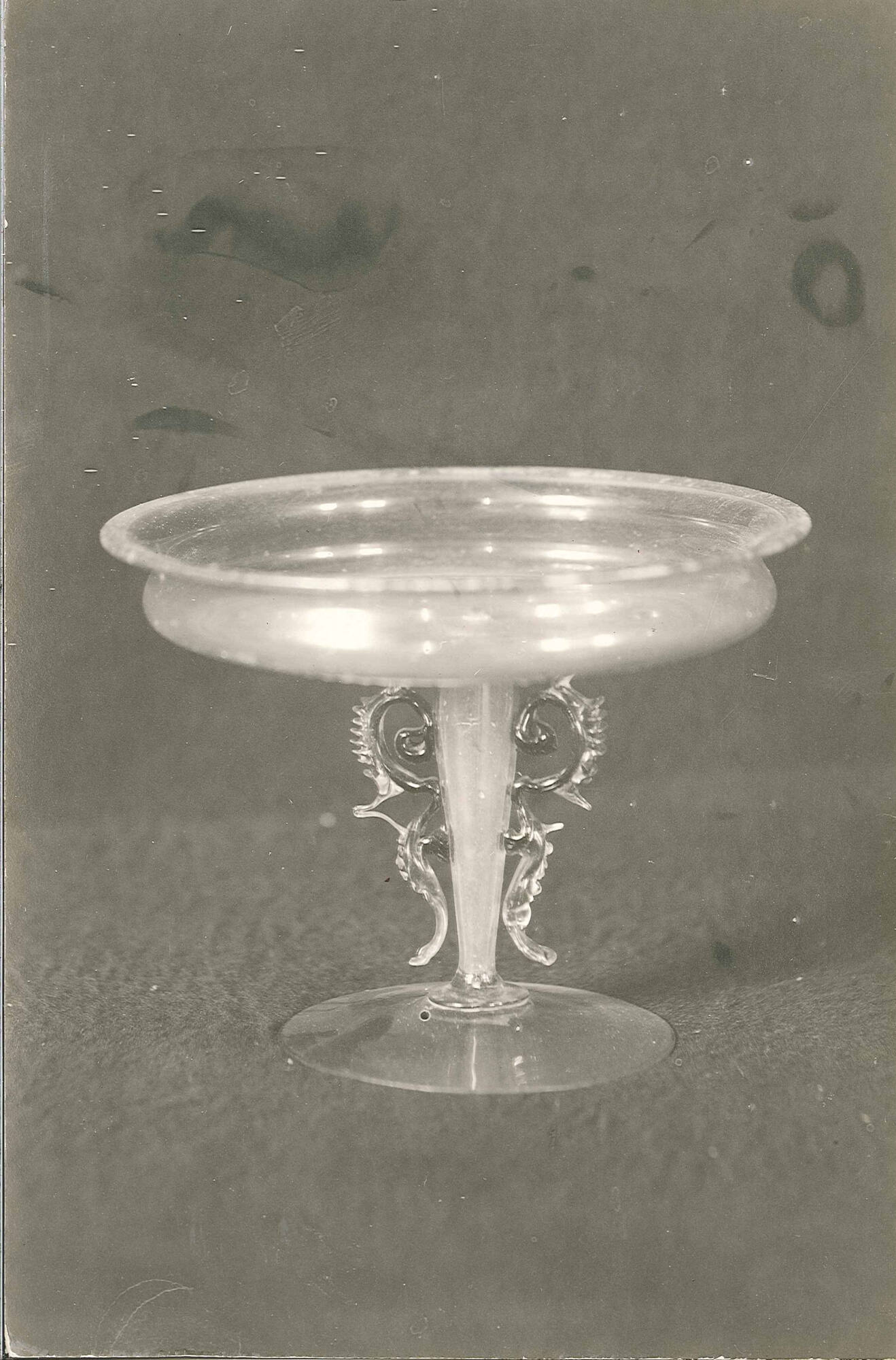 DescriptionClear glass. Blown with tooled decoration. Flat bowl with raised decoration consisting of drops of glass on bottom. Stem partly formed of blue glass ribbon, applied to hollow center.