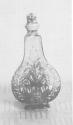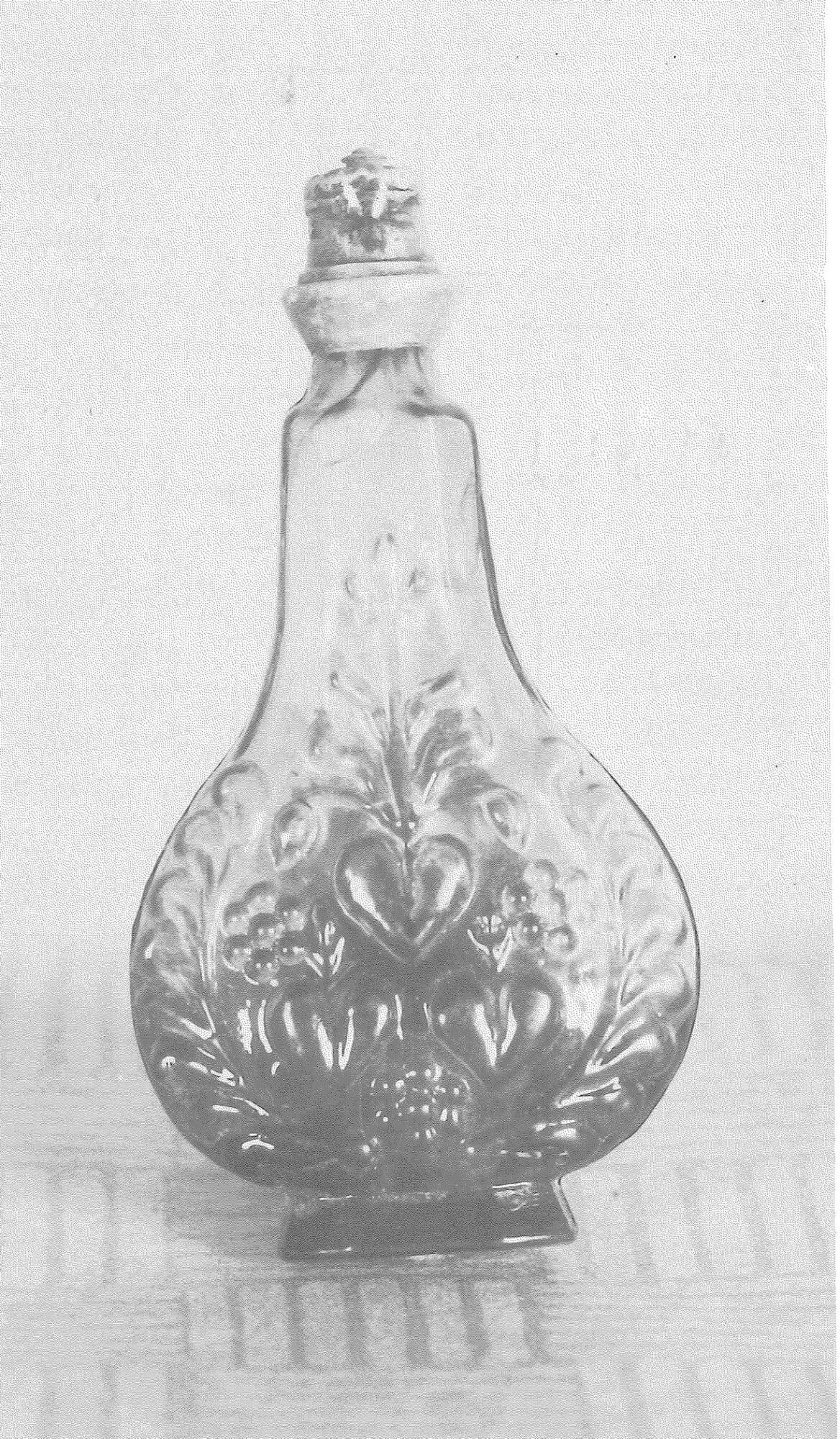 DescriptionAmber glass, mold-blown, with pewter stopper. Obverse: fleur-de-lys surmounted by a crown; Reverse: hearts surmounted by a floral branch.