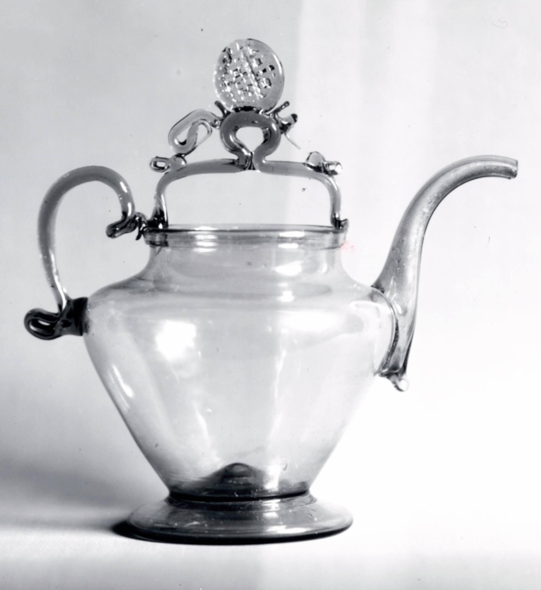 DescriptionSmoky in color with beak and handle, surmounted by another handle to carry it, ornamented with scrolls and a disk, characteristic of the Moorish influence