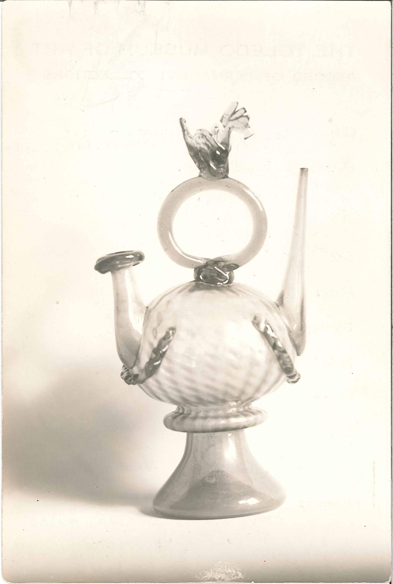 DescriptionLight greenish glass with raised garlands under neck and beaks, on the spirally designed body. Surmounted by a circular handle with a cock as top ornament.