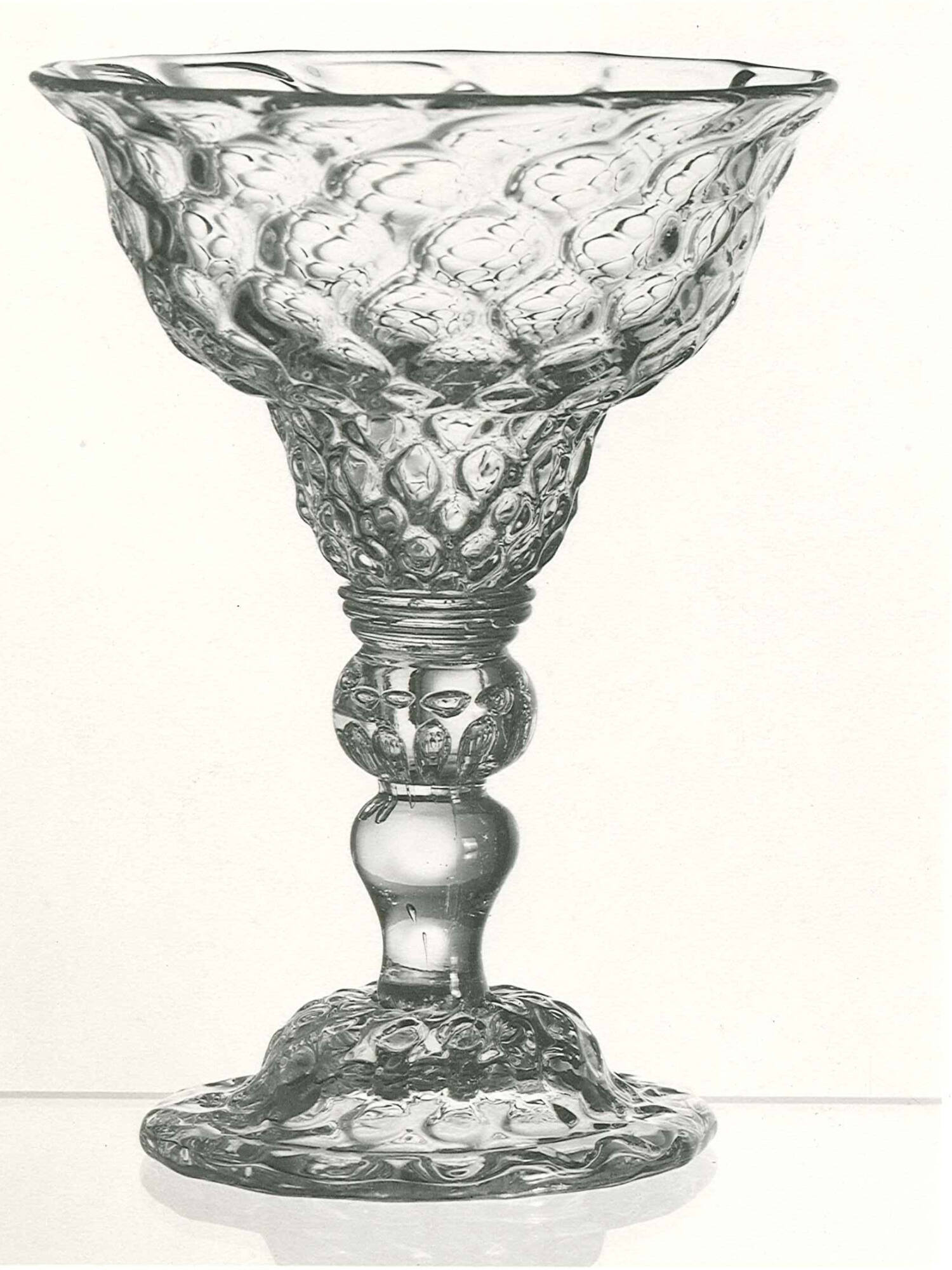 DescriptionClear glass, baluster stem, with tear drops; bowl and foot in ogival pattern