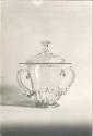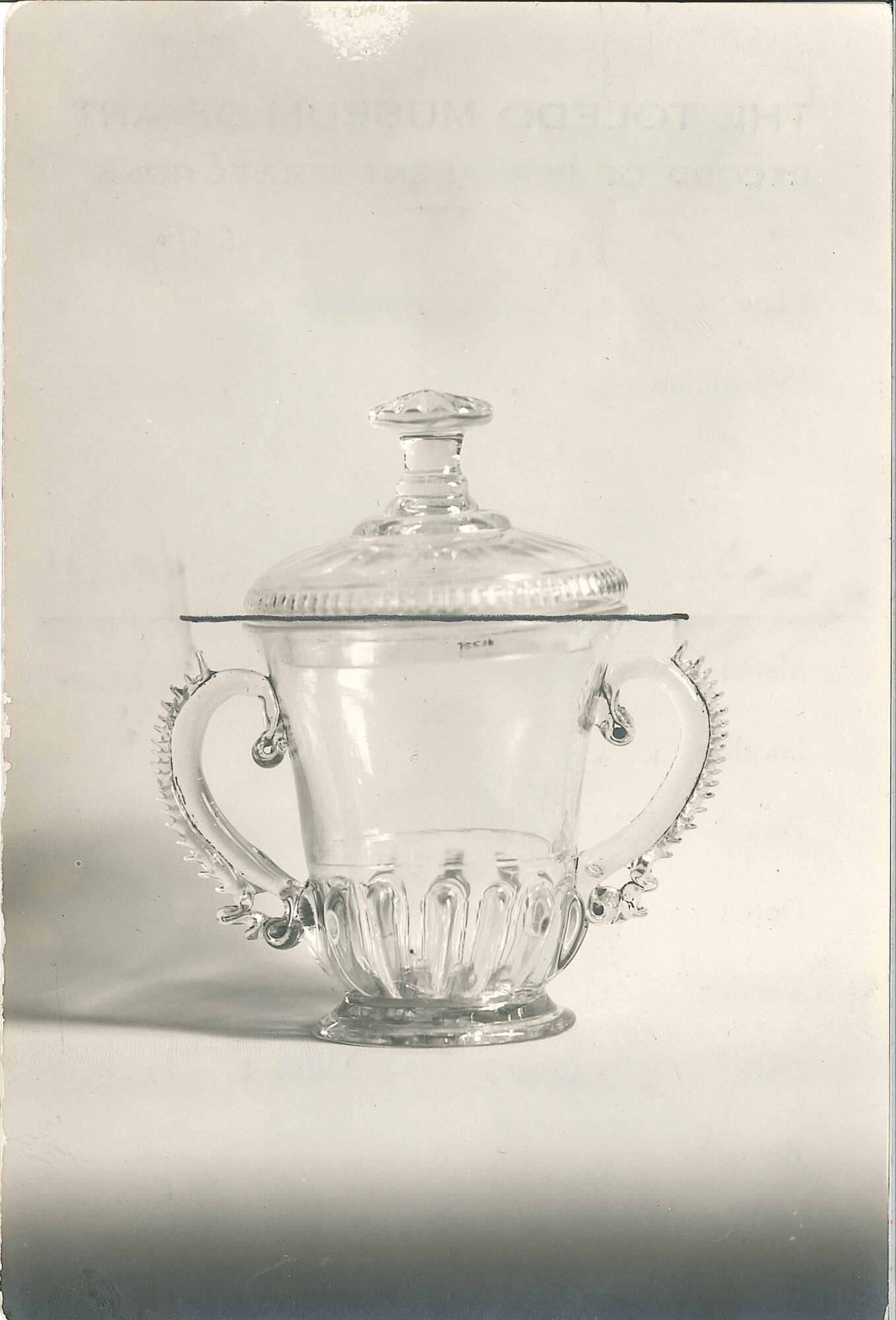 DescriptionTwo-handled, clear glass, fluted base, handles decorated with pinched trails.