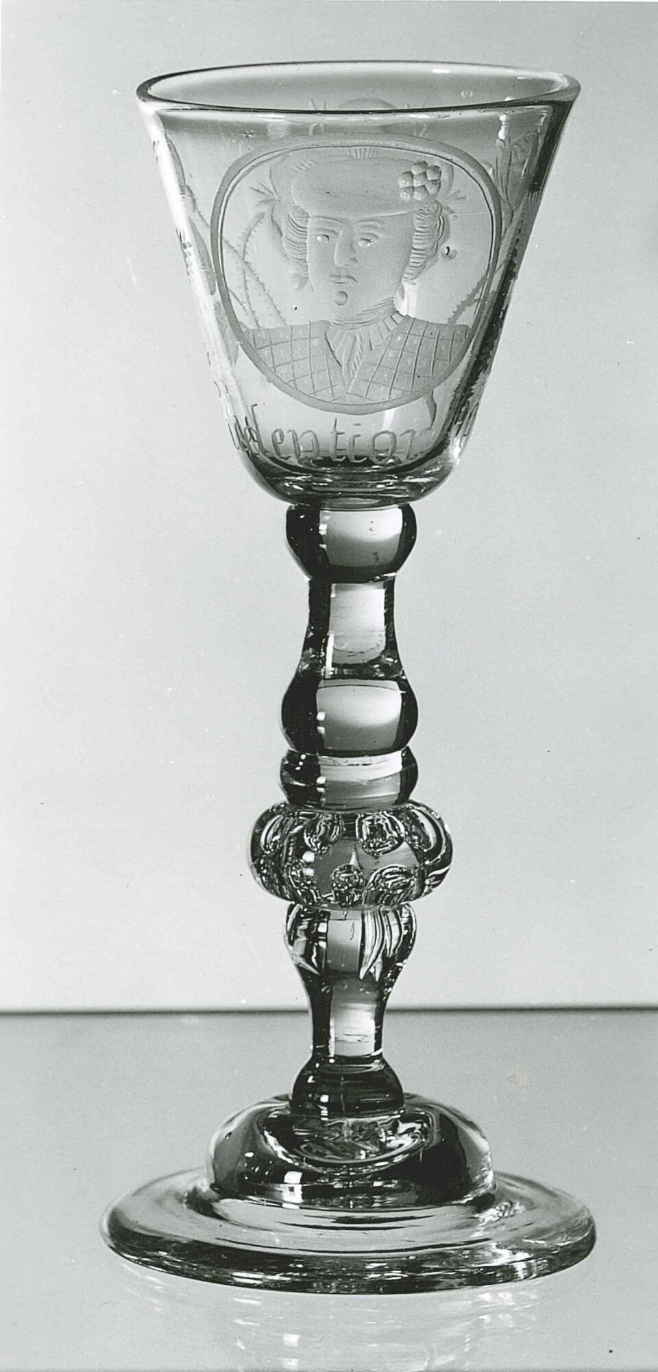 DescriptionKnopped balustroid stem. Center beaded knop. Domed foot. Clear glass.