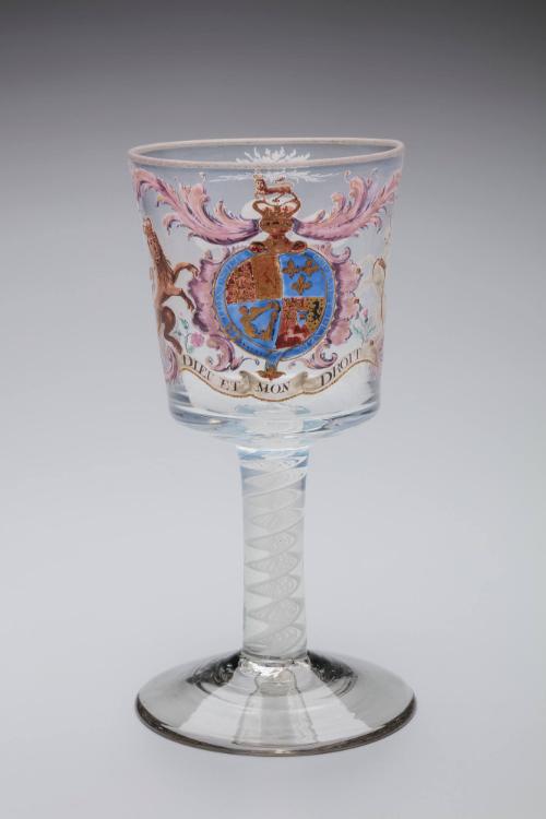 DescriptionClear glass with opaque white twist stem. Enameled and gilded with the arms of George III and the badge of the Prince of Wales.