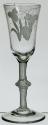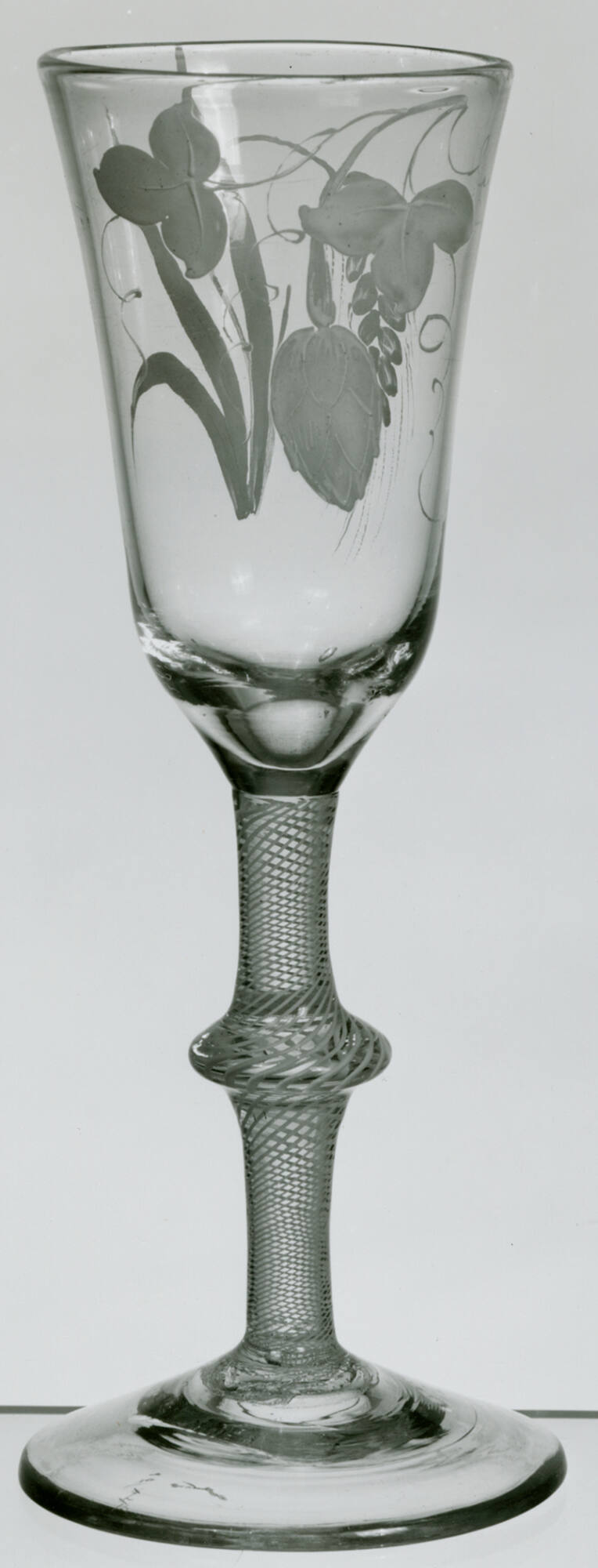 DescriptionClear glass with enamel decoration in white of hops and barley. Center-knopped opaque twist stem.