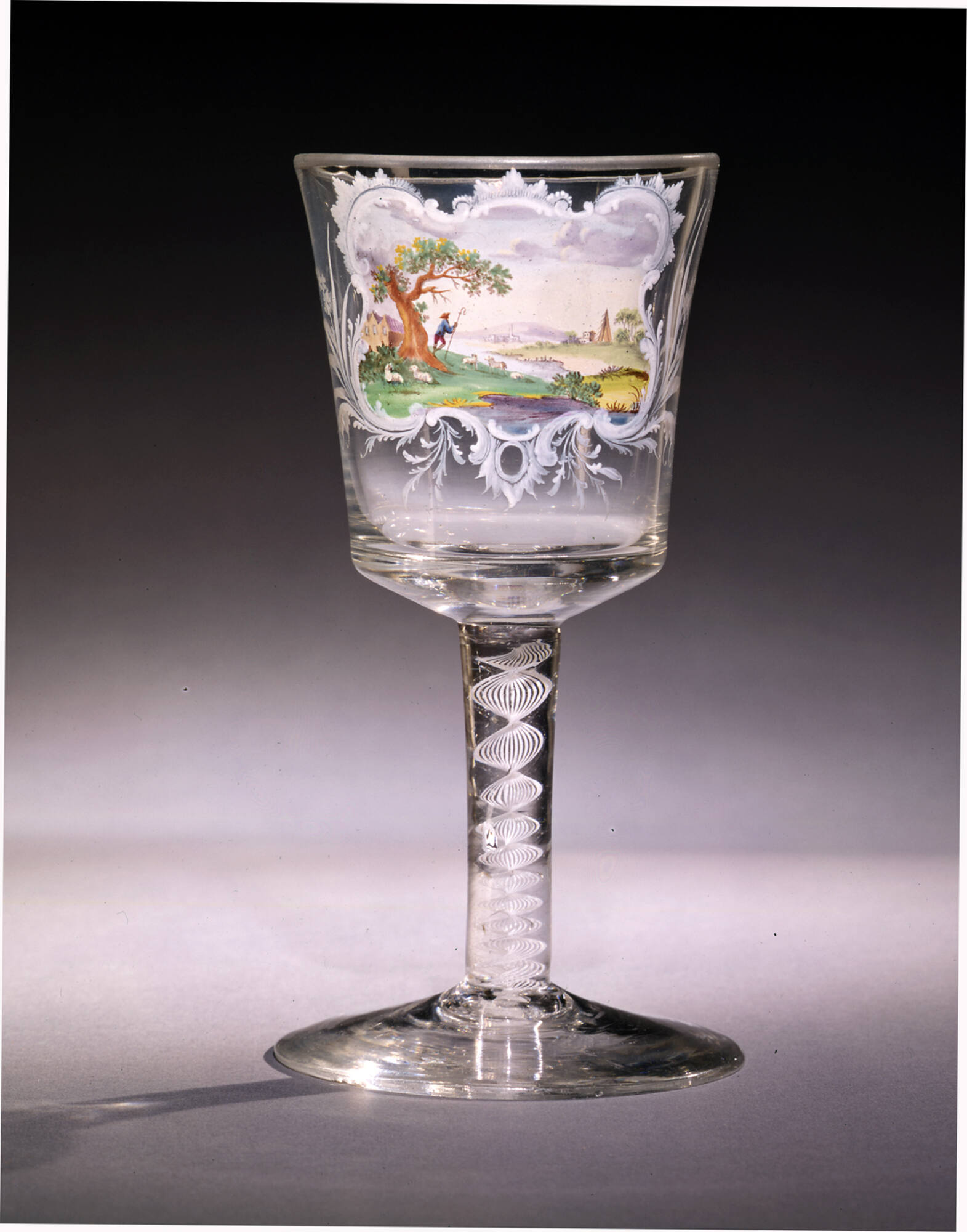 Label TextAs books and prints of travel and nature became popular items for the middle class during the second half of the 18th century, glasses and other decorative arts were manufactured in England with landscapes that reflected a romantic preoccupation with nature. The vignette on this goblet is painted in opaque enamels and features a shepherd and his flock within a landscape featuring a river or lake and a pyramidal tower probably representing a romantic architectural garden structure (called a folly).Published ReferencesPage, Jutta-Annette, The Art of Glass: Toledo Museum of Art, Toledo, Ohio, Toledo Museum of Art, 2006, p. 123, repr. (col.) fig 50C, p. 122.Exhibition HistoryToledo Museum of Art, Treasures for Toledo, Dec. 1964 and Jan. 1965.Late 15th century