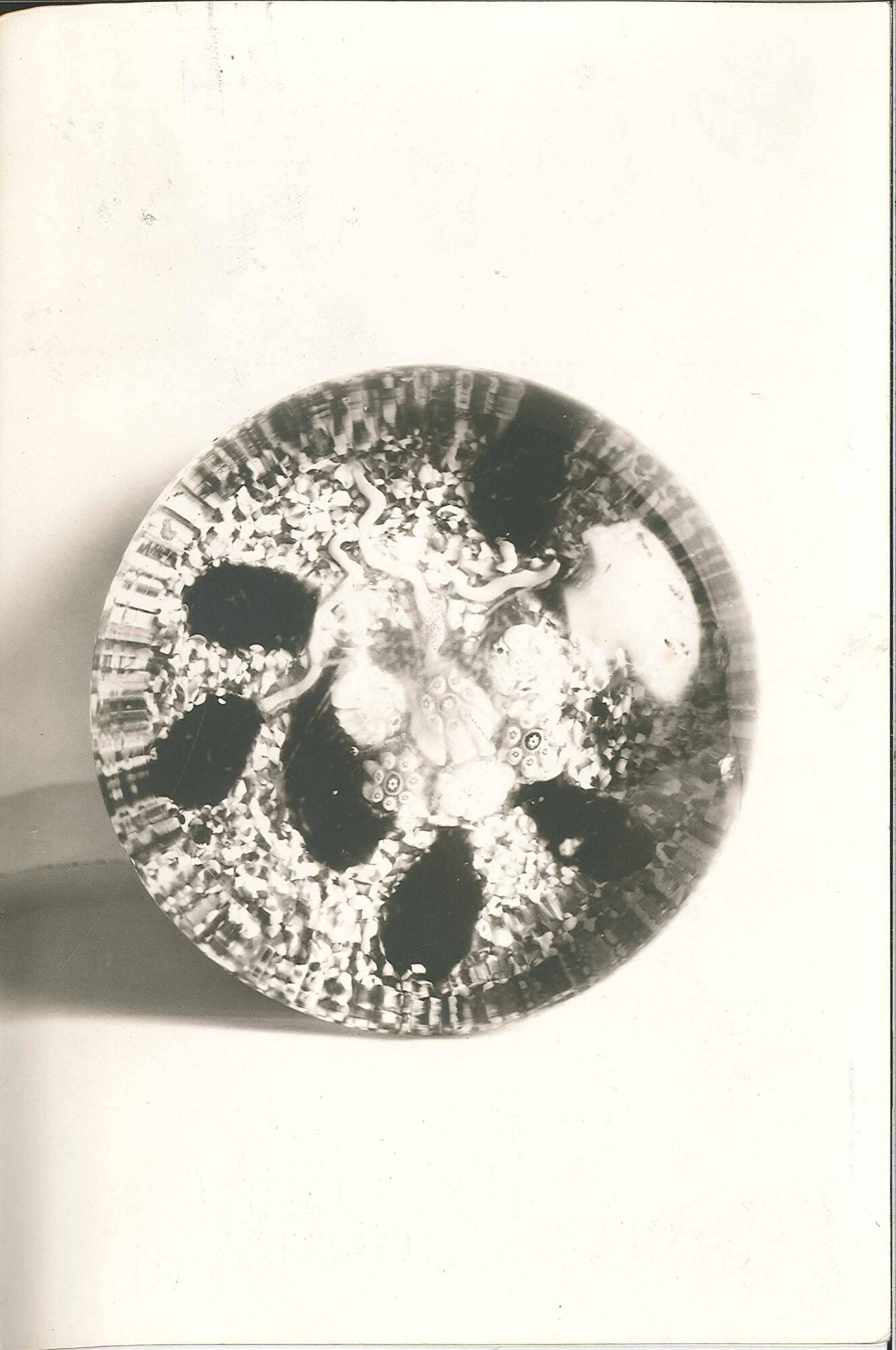 DescriptionEncased millefiori decoration. Colorless dome of unusually low profile enclosing flat bouquet of six millefiori canes, yellow stems, and dark green "bleeding" leaves; red and white jasper ground; on side, a torsade of yellow, blue and white, spiraling to right.