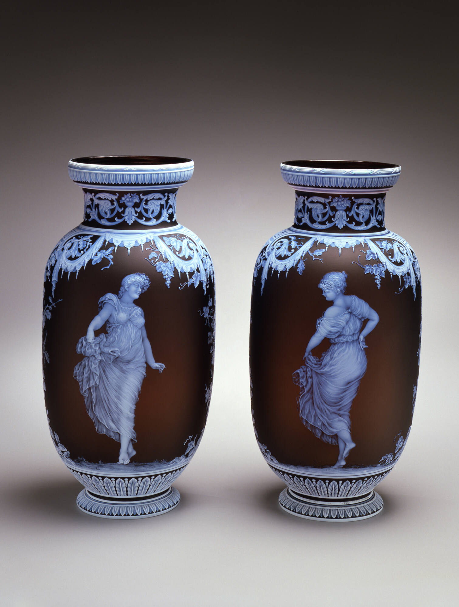 Label TextThese two vases were made at a time when the labor-intensive “Gem Cameo” technique began to be used at Thomas Webb & Sons, mostly for special commissions. In cameo glass, the outer layers of glass (here opaque white) are carved back to expose the colored glass beneath. Before long, cheaper technologies, such as acid-etching in England and thick enamel-painting in Germany and Bohemia, provided a similar look of relief decoration and undermined the market for expensive cameo-carved glass. The reverse of each vase shows the coat-of-arms of the Cure family of London combined with those of Cheyney of Berkshire and Upavon, Wiltshire.Published ReferencesPage, Jutta-Annette, The Art of Glass: Toledo Museum of Art, Toledo, Ohio, Toledo Museum of Art, 2006, p. 156-157, repr. (col.) p. 156.