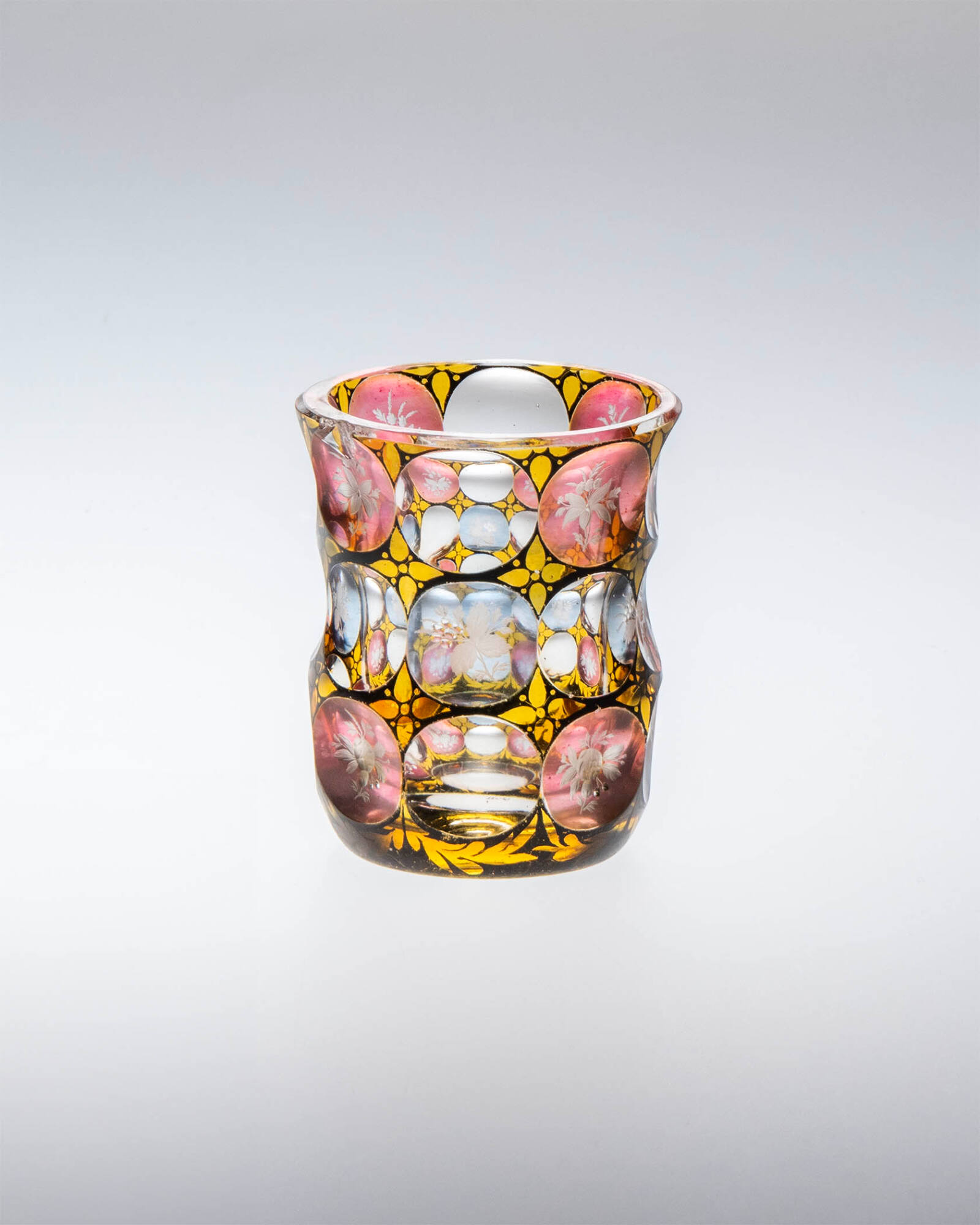 Clear glass with yellow, pink, and blue staining and black enamel. Concave facets intaglio engraved with flowers.