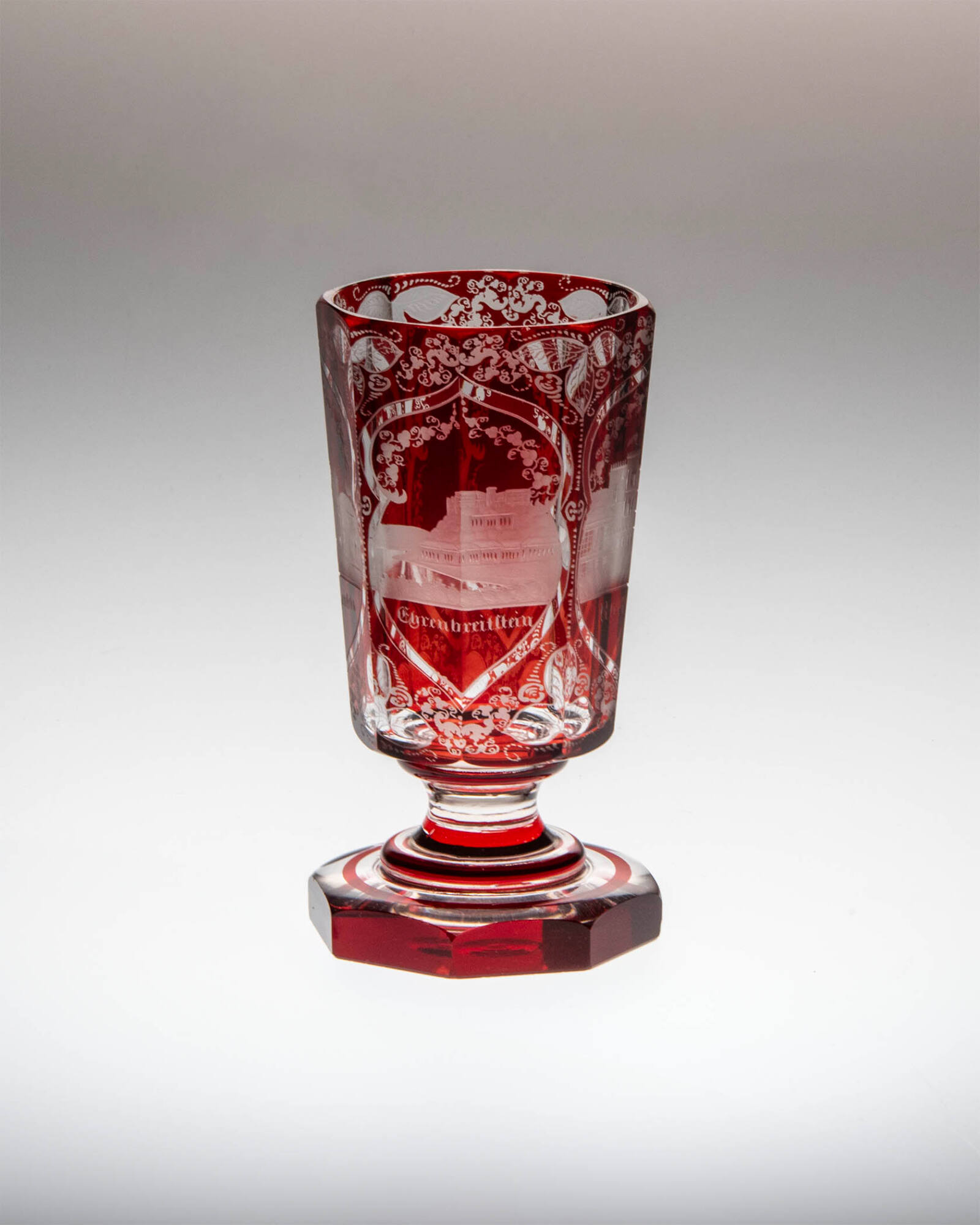 Colorless glass stained with red; panel cut; elaborately engraved with three castles, each with a name underneath; Stolzendels; Chrenbreitltein; Rheinftein; octagonal cut foot.