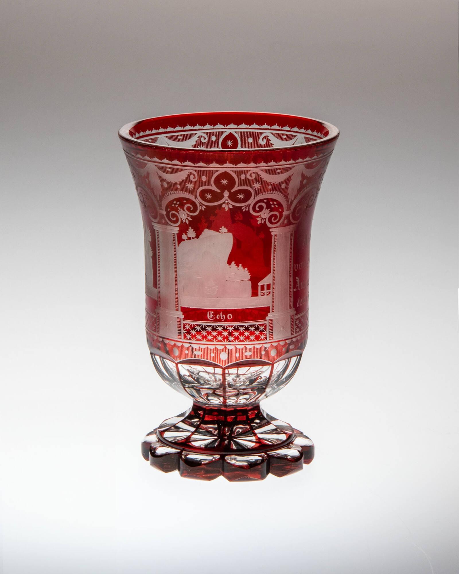 Colorless glass stained with red; bowl divided into four sections by engraved architectural elements; each of three sections with mountains, one entitled "Echo"; one "Wasserfall"; one "Brücke"; fourth section inscribed: "Andenten/von Adersback/Auguste Wendt/den. September 1, 1849."