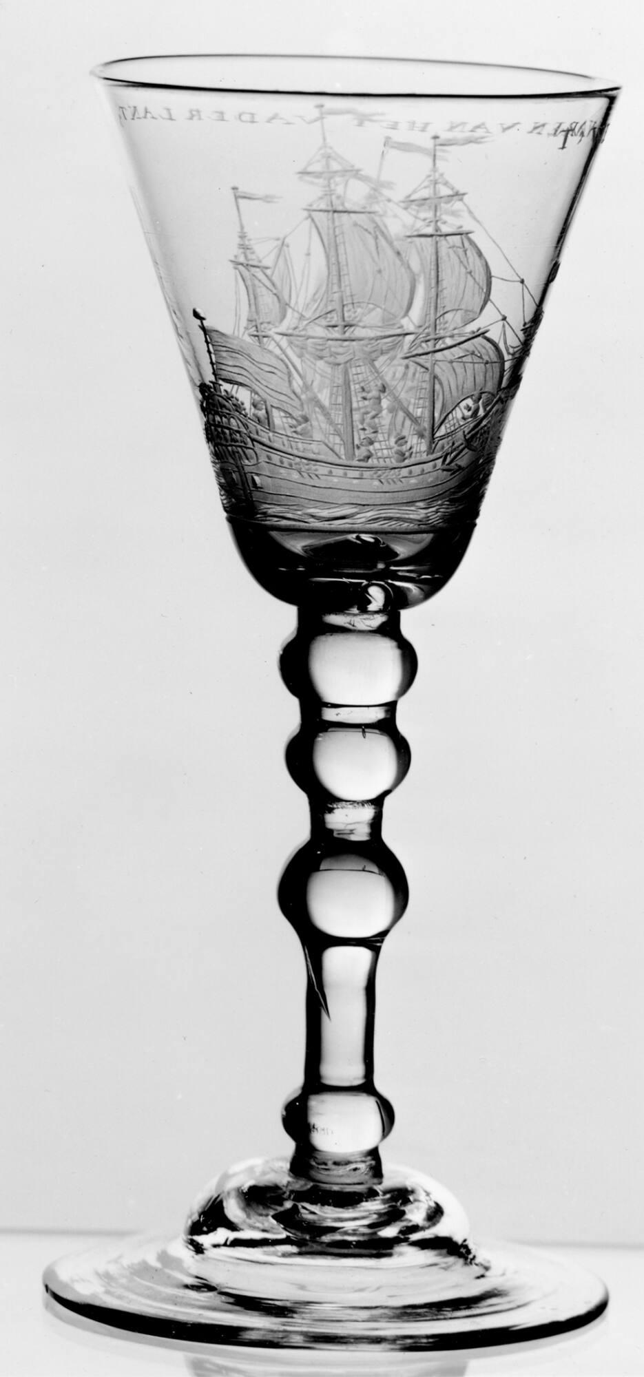DescriptionEngraved sailing vessels and inscription. Baluster stem, domed foot.