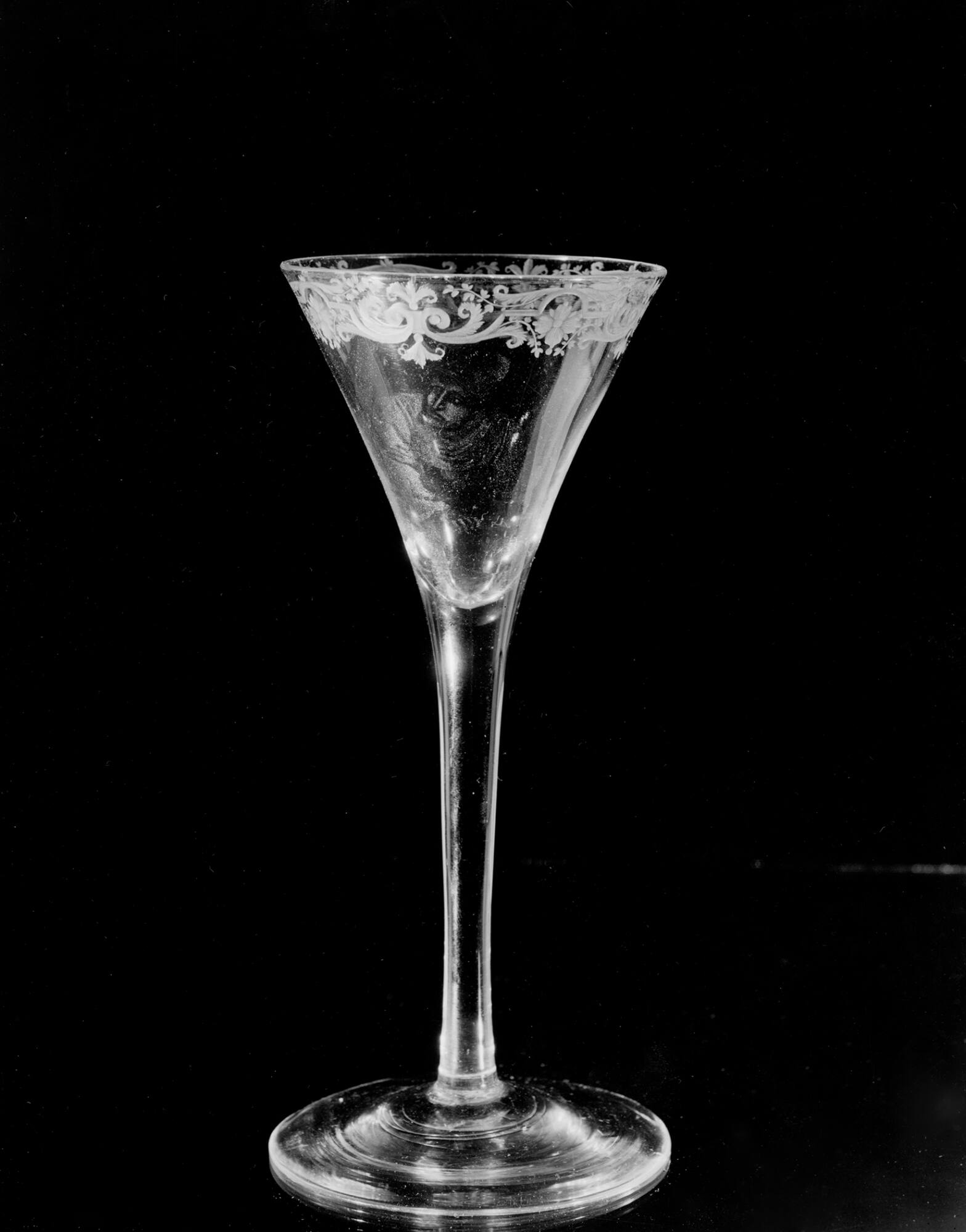 DescriptionColorless, conical bowl, wheel engraved flower and scroll decoration at top, in center of bowl: stipple design of a man leaning out a window, drawn stem, circular foot.