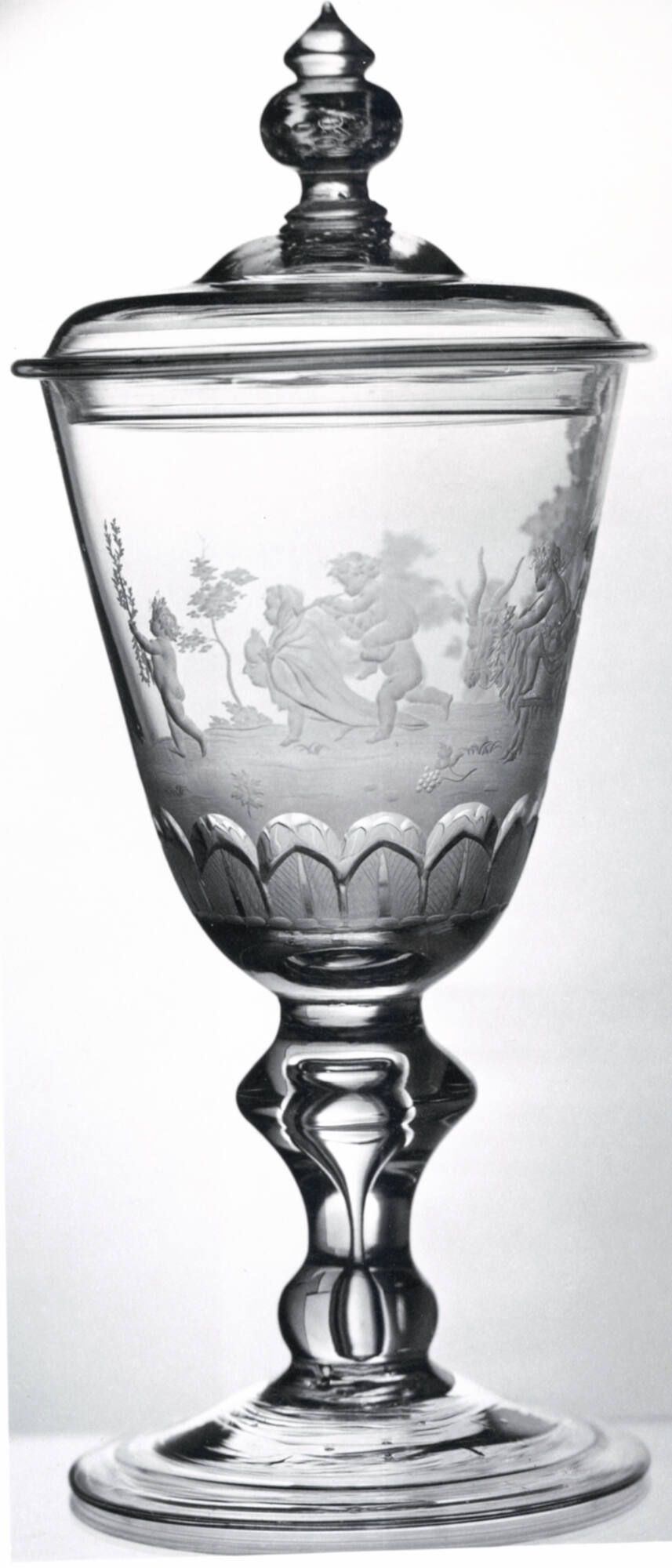 DescriptionClear glass. Putti in Bacchic procession. Band of acanthus foliage engraved in imitation of high relief.