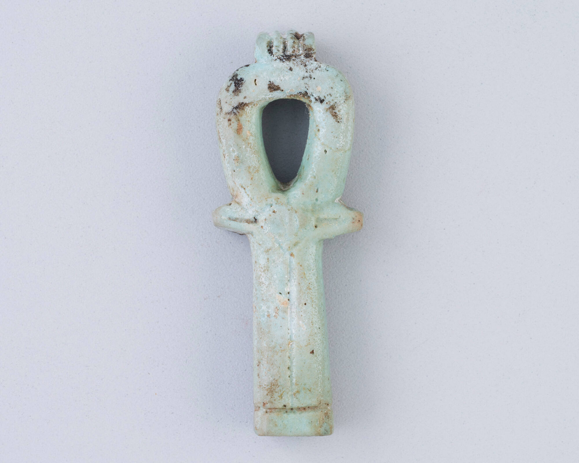 Label TextThis amulet is shaped like an ankh, the ancient Egyptian hieroglyph for “life” (ˁnḫ). Symbolizing both physical vitality and eternal existence, the ankh was one of the most powerful and widespread signs in Egyptian religion. This example is made of faience, a bright blue-green ceramic material whose color evoked fertility, regeneration, and divine protection. Ankh amulets were worn by the living for health and safety, and placed among mummy wrappings to ensure rebirth in the afterlife. In Egyptian art, gods often hold the ankh to the nose of a king or the deceased—a gesture conveying the breath of life (senef).Published ReferencesPeck, William H., Sandra E. Knudsen and Paula Reich, Egypt in Toledo: The Ancient Egyptian Collection at the Toledo Museum of Art, Toledo, Toledo Museum of Art, 2011, p. 78, repr. (col.) p. 79.Exhibition HistoryToledo Museum of Art, The Egypt Experience: Secrets of the Tomb, 2010-2012.Unidentified