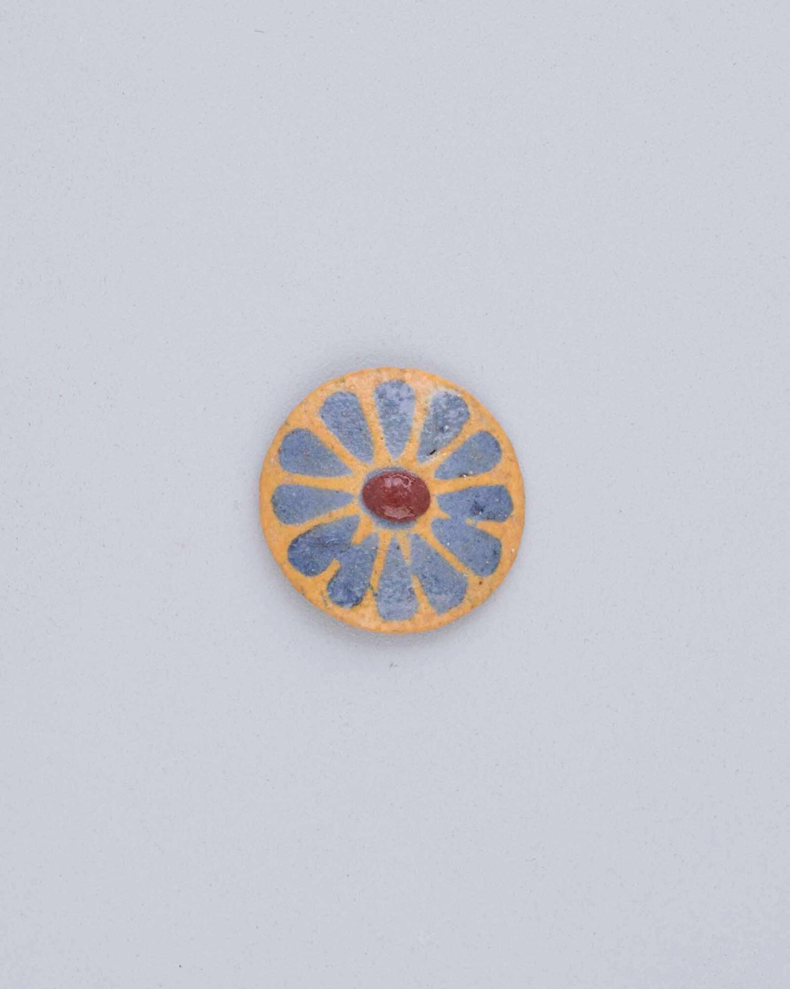 DescriptionA small faience inlay or button-like ornament, circular in form, with a central rosette motif. The design consists of bright blue petals radiating from a central red core, all set against a yellow faience background.