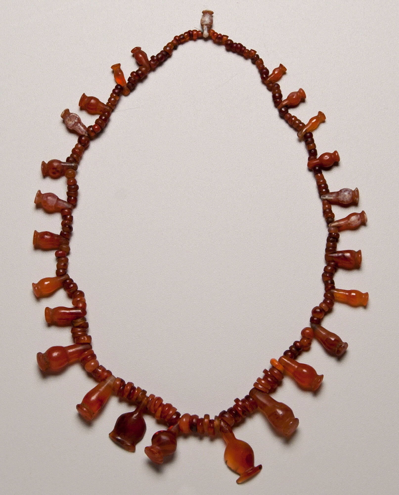 Label TextThis necklace consists of forty-three carnelian beads, several of which are shaped like flower buds—likely representing poppies or cornflowers. Both flowers were common in ancient Egyptian gardens and carried symbolic associations with beauty, rebirth, and ritual offerings. Floral bead forms were especially popular during the New Kingdom, when this necklace was likely made. The beads were excavated at the ancient city of Amarna, the capital founded by Pharaoh Akhenaten in the 14th century BCE, during the 1923–1924 excavation season led by the Egypt Exploration Society. Through the Society’s official division of finds, the beads were allocated to the Toledo Museum of Art in 1925. At some point after their arrival, the necklace was restrung together with a separate group of beads acquired earlier (accession 1915.131) to create a visually appealing presentation. The current strand does not replicate an original ancient composition, but reflects a modern display strategy for exhibition.Exhibition HistoryToledo Museum of Art, The Egypt Experience: Secrets of the Tomb, October 29, 2010-January 8, 2012.18th–19th Dynasties (1550–1189 BCE)