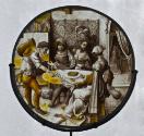 Label TextPart of a moralizing series recounting the adventures of the popular Netherlandish character Sorgheloos (Carefree), this window would have decorated either a private home or a public building like a tavern. Sorgheloos sits at a table in a brothel, carelessly spending his money on women, drink, and gambling. He plays dice with a shabby seller of crullers, Lichte Fortune (Fickle Fortune), to whom he will lose his money.Published ReferencesFalke, O. V., Die Kunstsammlung von Pannwitz, Munich, 1926, II, no. 114. (as Flemish, ca. 1540)