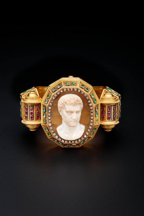 Mediumgold, rubies, emeralds, diamonds, and agate cameo