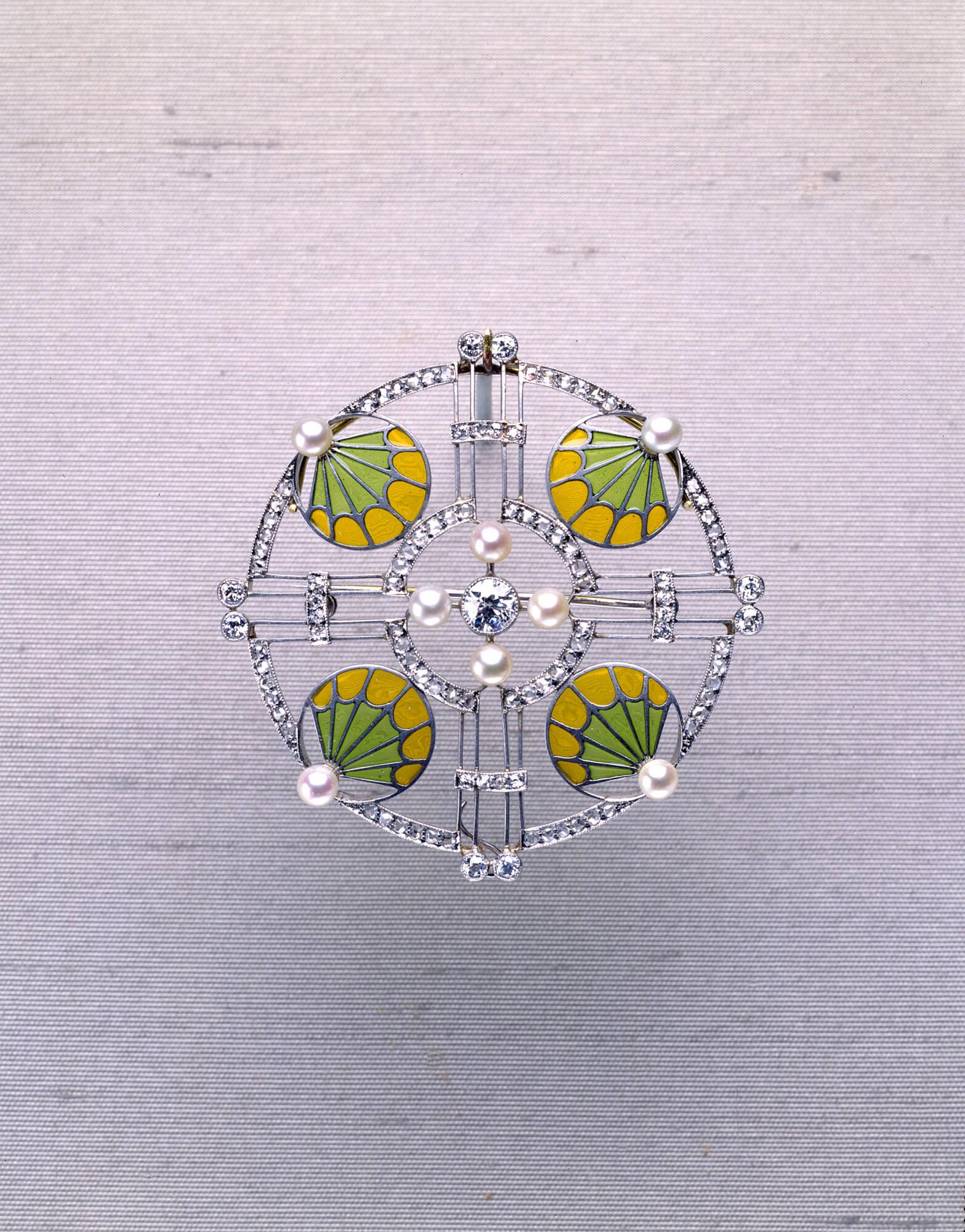 MediumPlatinum, pearls, plique-a-jour enamel, and diamonds