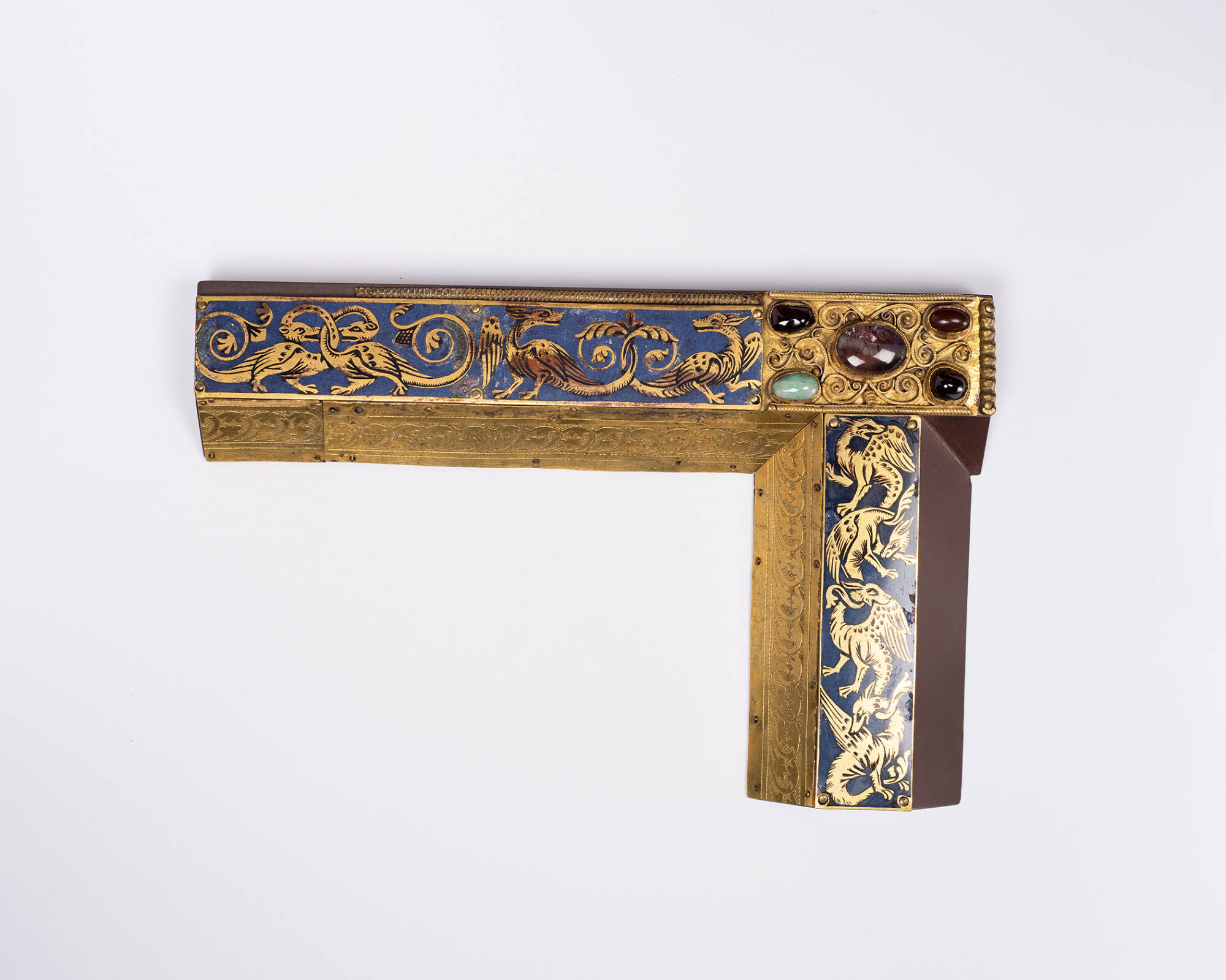 MediumChampleve enamel; filigraine panel mounted with semi-precious stones and 3 pieces engraved copper