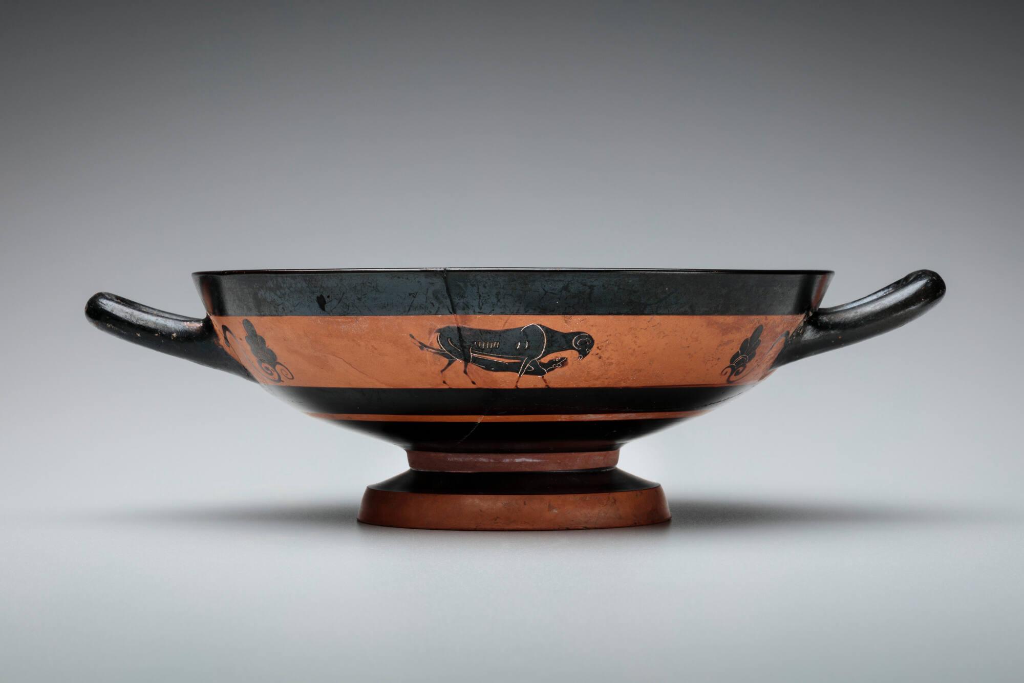 Label TextBut as for me—there was a ram, far the best of all the flock; him I grasped by the back, and curled beneath his shaggy belly, lay there face upwards with steadfast heart, clinging fast with my hands to his wondrous fleece. (Odyssey, Book 9) Trapped inside the cave of the Cyclops Polyphemos, wily Odysseus must think fast in this episode from the Odyssey as each day the monster devours more of his men. Together they manage to blind the drunken Polyphemos with a long wooden stake. On the sides of this cup, we see their escape as Odysseus ties each man underneath the Cyclops’ sheep so that they could leave, undetected, as the flock went out to feed. On one side of the cup, the man depicted is beardless and young, while on the other side a bearded man, likely Odysseus himself, clings underneath the ram.Published References