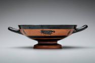 DescriptionA stemless drinking cup (kylix) with a wide, shallow bowl and horizontal handles. Decorated in the black-figure technique, it depicts the escape of Odysseus and his men from the Cyclops Polyphemos’ cave. The composition includes two contrasting figures: a young, beardless man on one side and a bearded man, likely Odysseus, on the other. The kylix has been broken and repaired.