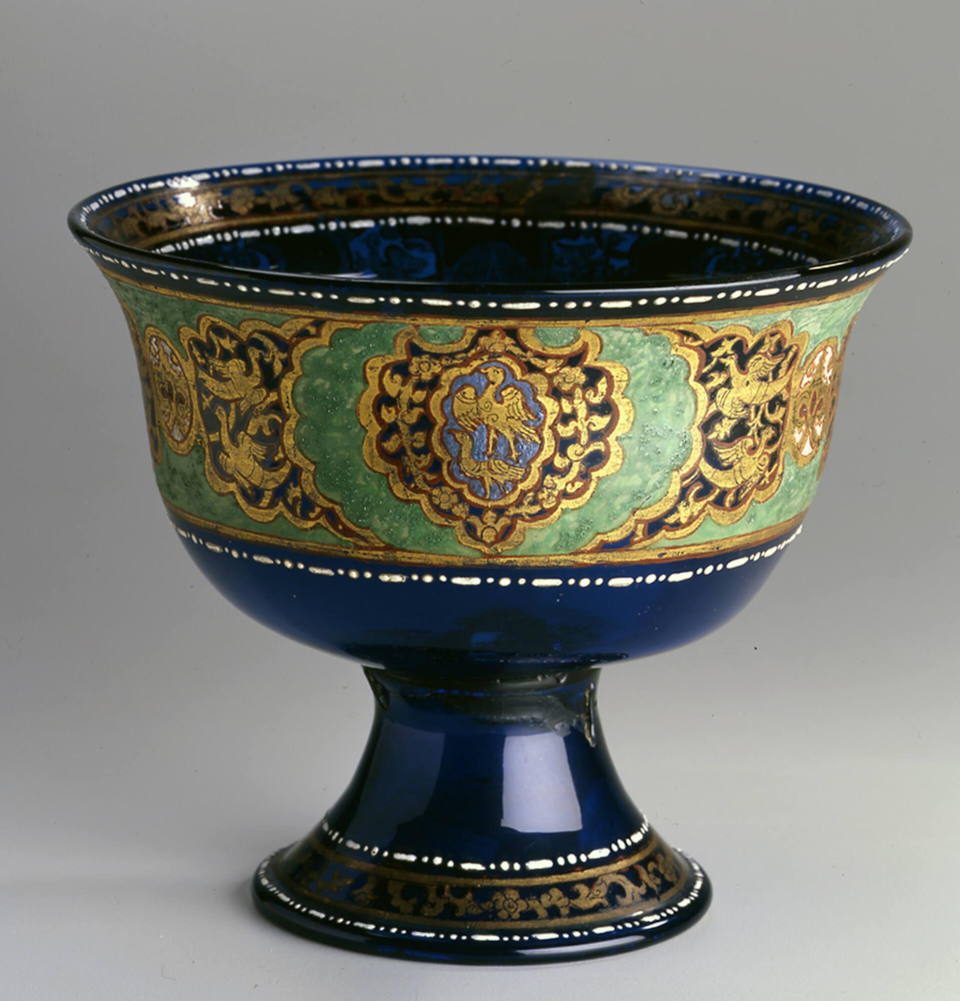MediumBlue glass decorated with green, gold, red and white enamel
