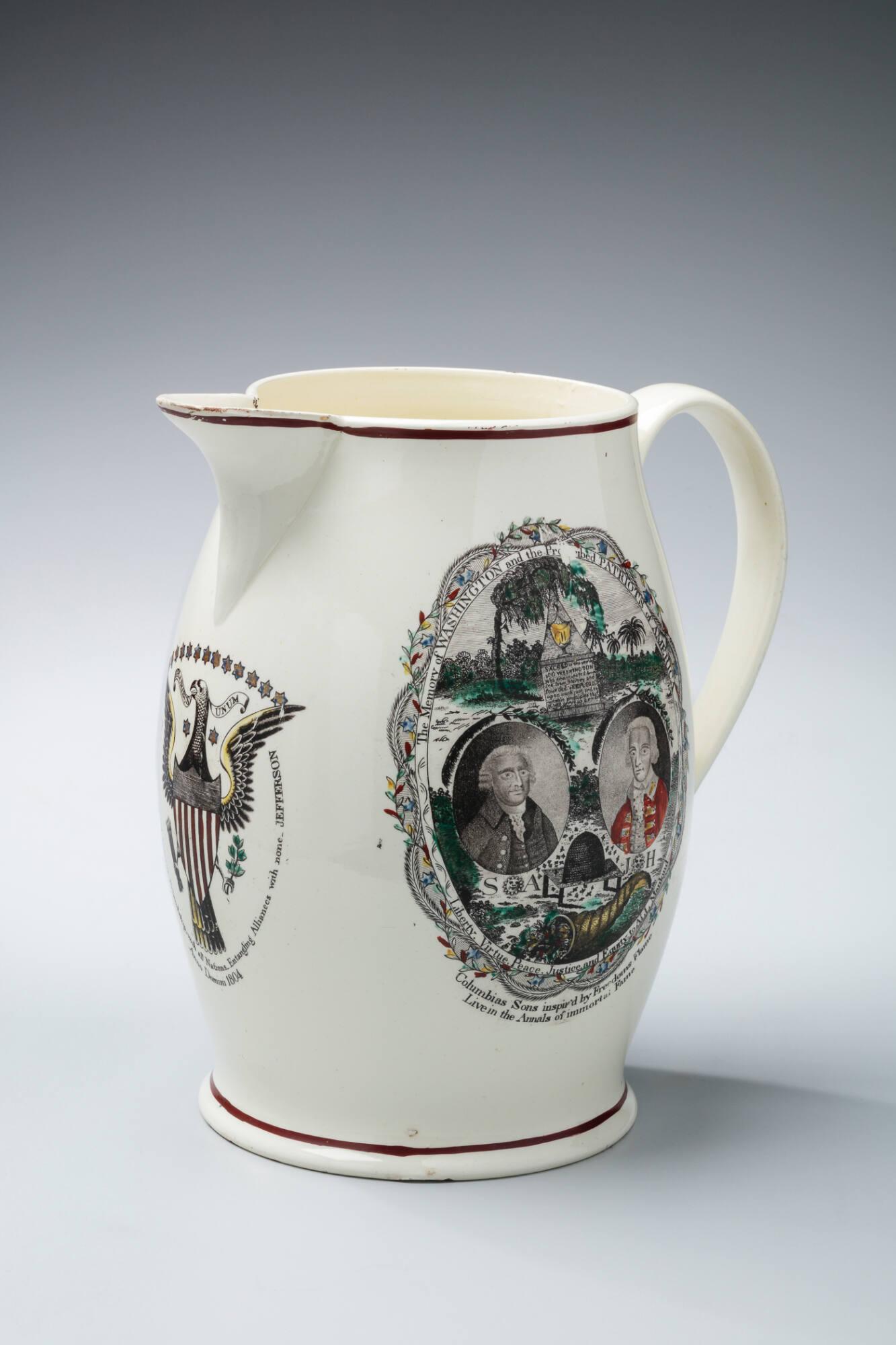 Label TextGeorge Washington’s death in 1799 prompted an extended period of national mourning. Many commemorative objects were produced expressing patriotic sentiments and memorializing the new nation’s first president. This pitcher, produced in Liverpool, England, features Washington’s tomb flanked by portraits of “the proscribed patriots of America, Samuel Adams and John Hancock.” An inscription scrolling around the men reads, “Columbia’s [America’s] Sons inspired by Freedom’s Flame live in the Annals of immortal Fame.” The reverse of the pitcher features an American militiaman with the stars and stripes.after 1813