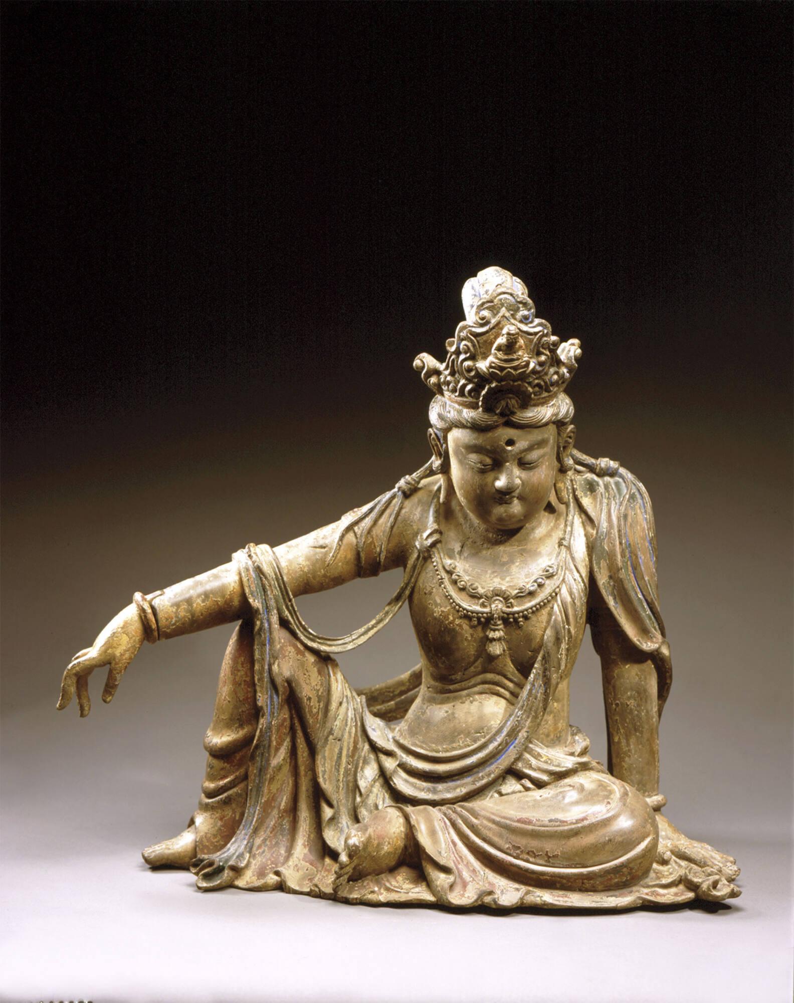 Label TextThe calm, sensitive face and informal posture of "royal ease" of this figure express both compassion and strength. Guanyin is a bodhisattva (boh-dee-SOT-vah): a Buddhist deity who helps mortals to attain release from the cycle of earthly life. Though usually represented as female by the time of the Ming Dynasty (1368-1644), this sculpture looks back to an earlier tradition showing Guanyin as a graceful, androgynous prince. One of the most popular Chinese deities, Guanyin comforts the souls of the dead and acts as mediator for the wishes of the living. Carved from interlocking blocks of wood and once brightly painted, this sculpture originally sat on an artificial rocky ledge as part of a visually rich temple setting in north China.Published References"Buddhist Sculpture of Shanxi Province" from the Research Institute of The Buddhist Association of China at Po Lin Monastery.Comparative ReferencesSee also "Buddhist Sculpture of Shanxi Province" from the Research Institute of The Buddhist Association of China at Po Lin Monastery. See also "The Arts of the Ming Dynasty," exhibition catalogue organized by The Arts Council of Great Britain and The Oriental Ceramic Society, London, 1957. See also Sullivan, Michael. The Arts of China, 4th edition, Berkeley, 1999, pp. 233. See also "The Arts of the Ming Dynasty," exhibition catalogue organized by the Detroit Institute of Arts, Detroit, Michigan, 1952.about 1525-1550