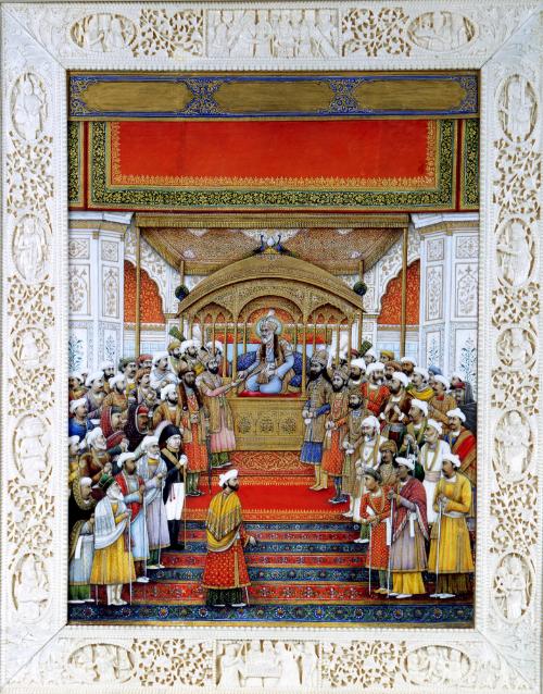 Label TextPainted on ivory and surrounded by an intricately carved ivory frame, this dazzling and detailed painting depicts the Mughal emperor Akbar II (ruled 1806–1837), seated on a peacock throne during a darbar, or royal audience, in the capital city of Delhi, India. The Mughals were a dynasty of Islamic rulers in India, originally from Central Asia. The painting would have been created to give as a presentation gift to one of the dignitaries and guests of the emperor who attended the darbar. Notice the British Resident, Sir David Ochterlony, who appears in military uniform in a position subservient to the emperor. In reality, the balance of power was just the opposite—the power of the Mughal emperors was almost at its end at the time this was painted, while the British presence in India was growing.Published ReferencesToledo Museum of Art, Toledo Museum of Art Masterworks, Toledo, 2009, p. 37, repr. (col.).Comparative ReferencesSee also E. Smart and D. Walker, Pride of the Princes: Indian Art of the Mughal Era in the Cincinnati Art Museum, 1985. (cat. #19)