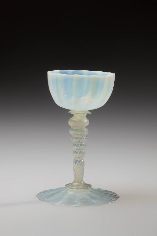 DescriptionRibbed, mold-blown goblet blown of opalescent glass with cup-shaped bowl, set on a merese above a hollow, tapering stem that is tooled into five ovoid knops of decreasing size followed by a tapering stem section, the whole applied on a basal collar over a spirally-ribbed conical foot.