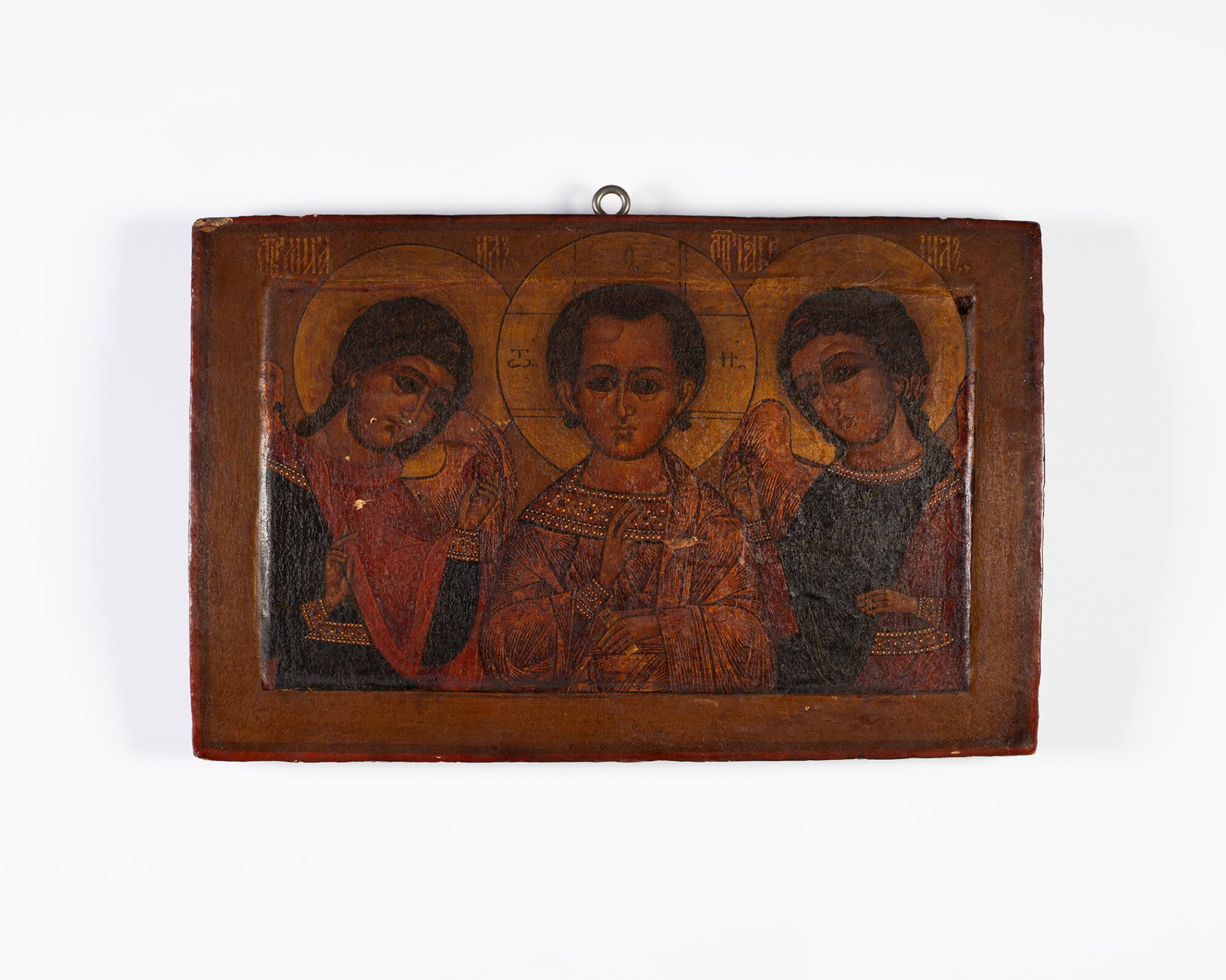 DescriptionWood panel. Christ with Archangel Michael and Gabriel. No metal decoration. Golden brown color scheme.