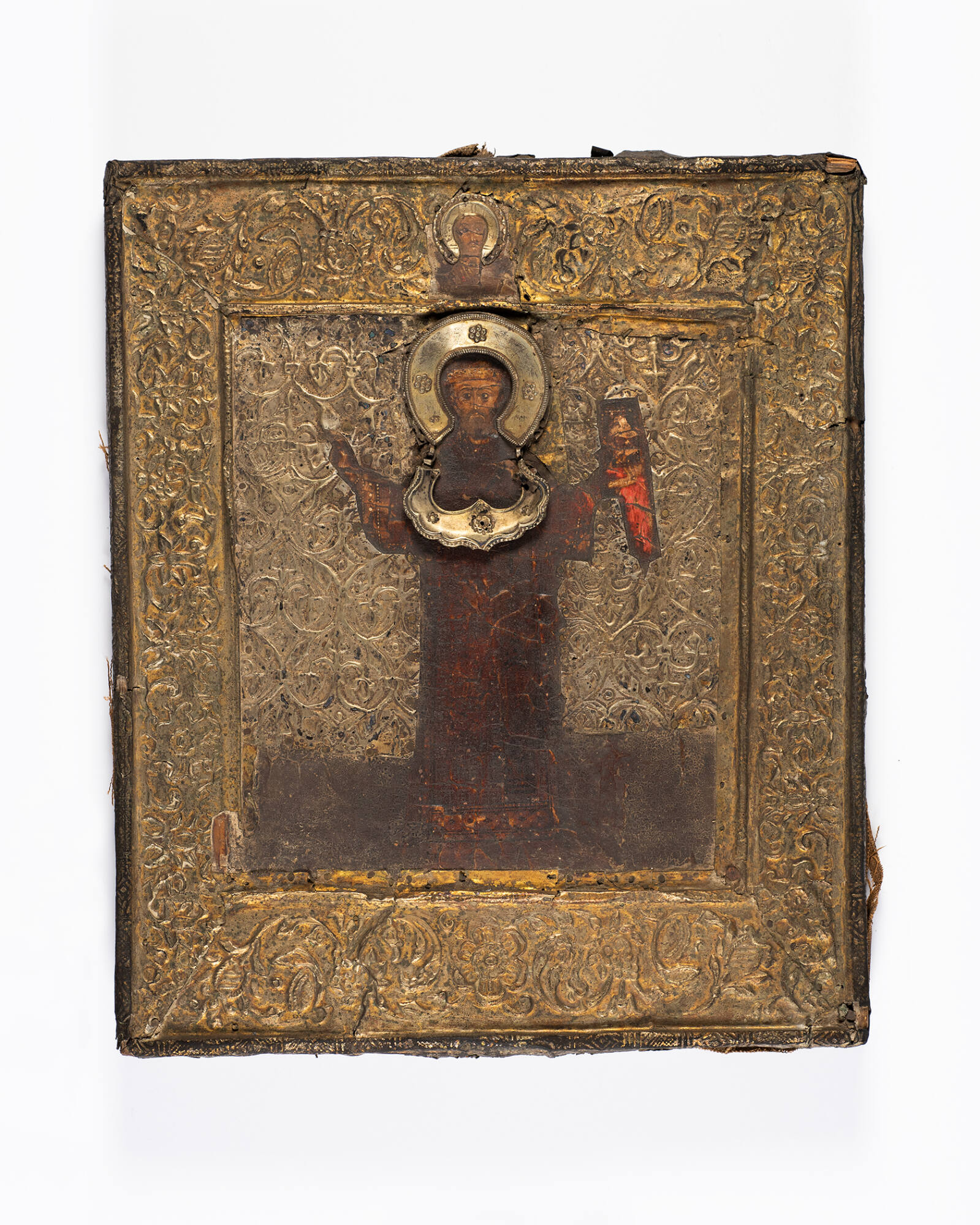 DescriptionFigure of St. John, with head of Christ above. Background entirely covered with silver repoussé pattern.