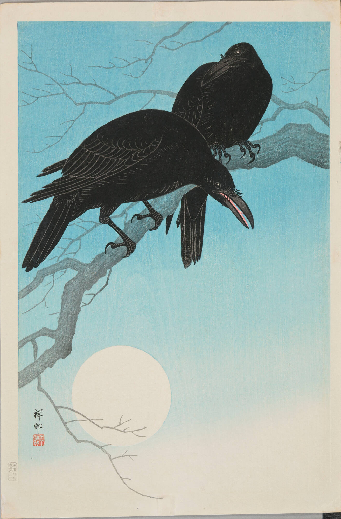 Label TextOne of Ohara Koson’s favorite subjects, the jungle crow was revered in Japanese folklore as a messenger of the gods. Koson’s keen sense of design is showcased in this print with the black crows on a bare branch at the top of the composition arching across the silvery blue moonlit sky, balanced below only by the orb of the moon.