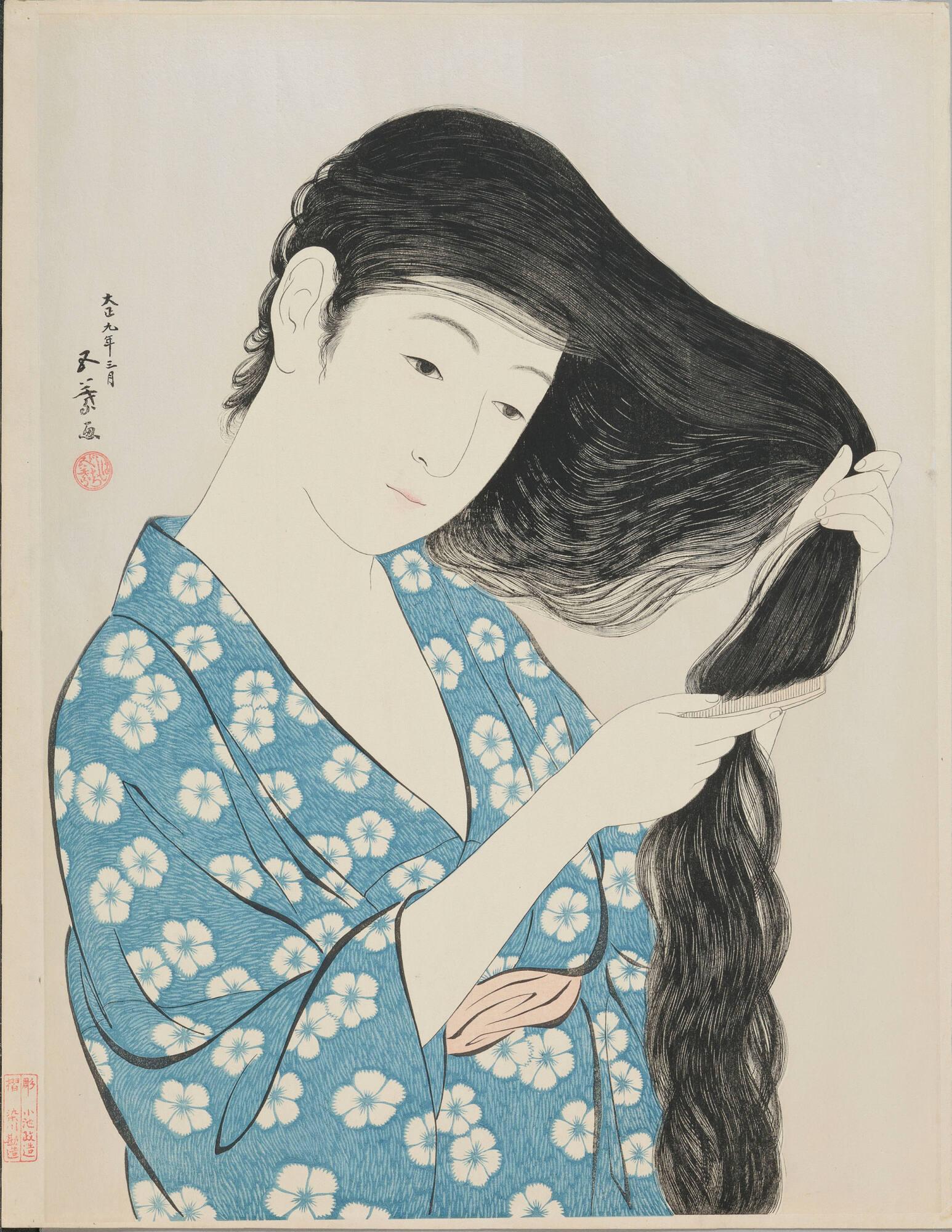 A woman dressing or grooming after a bath was a popular subject with many of these “new print” movement (shin hanga) artists. The subject linked the prints to the erotic undertones of Edo images of courtesans. Borrowing from Western artistic practices, Hashiguchi Goyō and other shin hanga artists produced “pictures of beautiful women” (bijin-ga) by sketching models from life. Goyō used the features of model Kodaira Tomi for this print, though in simplified, idealized form.