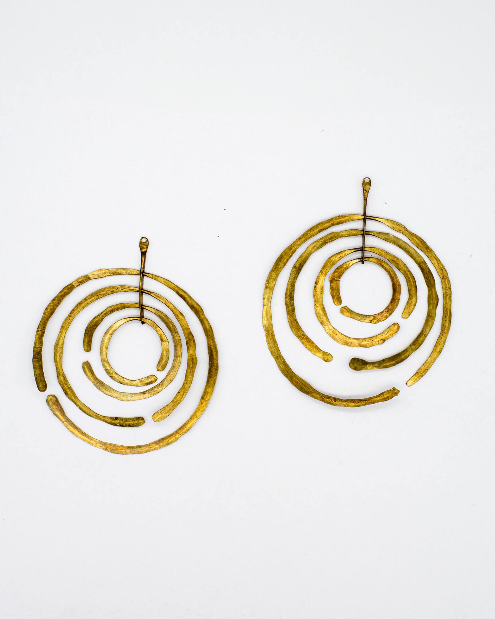 DescriptionThe pair of hoop earrings is each constructed of four brass hoops of increasing size. The hoops are made of brass wire passed through a row of four small drill holes in a narrow strip of brass. Bent into concentric circles whose ends do not meet and do not overlap, they were then hammered flat on a slightly marred surface, picking up scars and imperfections in relief on one side and scratches from the hammering tool in intaglio on the other. The brass hoops have a natural oxidation patina. The two gold-plated suspension "fish-hooks" are modern replacements.