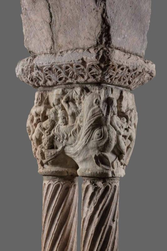 Label TextThe capitals on the left depict scenes from the Old Testament and important episodes associated with the life of Saint Pontius (Pons in French), patron saint of the monastery of Saint-Pons-de-Thomières (TOM-ee-yair). Born in 3rd-century Rome, Pontius converted to Christianity at a time when several Roman emperors violently persecuted Christians. Pontius traveled as a missionary to the Roman province of Gallia Narbonensis (today part of southern France), where he established a church and set about converting local people to Christianity. The Roman governor of the Gauls, Claudius, had Pontius arrested and tortured in various ways for refusing to worship pagan idols and affirming his Christian faith. On one capital, we see Claudius raising his hand to order that Pontius be thrown to two bears. Instead of attacking, however, the bears lick his feet. Finally, the governor orders his beheading, as seen directly to the left. The devotional cult surrounding Saint Pontius included much of Catalonia (today in northeast Spain) and southern France, with Saint-Pons-de-Thomières serving as an important center of the cult.Published ReferencesSahuc, J., L'Art Roman à Saint-Pons-de-Thomières, Montpellier, 1908, pp. 70-76, 81, 83f., pls. F-H, K, L. (dates late 11th to late 12th centuries).