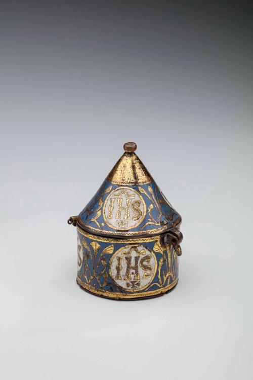 Label TextA pyx is a vessel for holding the Eucharistic wafers consecrated during the mass as Christ’s body, called the “host.” The Christogram or monogram meaning Jesus, IHS, inscribed within disks of white enamel, emphasizes the object’s function. The circular forms recall a common shape of the host.13th century