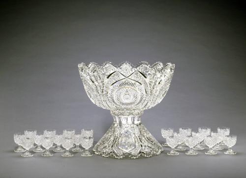 Label TextThis punch bowl set, produced as a showstopper for the 1904 St. Louis World Fair (the Louisiana Purchase Centennial Exposition), employed all of the skill and artistry of the Libbey Glass Company’s best glassmakers. Proclaimed the largest single piece of cut glass in the world at the time, the blown, bowl-shaped “blank” of glass that would become the punchbowl weighed 143 pounds. The design was roughed out with iron wheels that cut away chunks of the glass (ultimately some 30 pounds of glass would be cut away from the blank). Two of Libbey’s premier glassworkers, J. Rufus Denman and Patrick W. Walker, did the labor-intensive fine cutting that finished the design. A drama unfolded during the making of the punch bowl: a flaw caused the bowl to crack during the final stages of cutting and polishing, and the glassmakers—now several weeks behind—had to scramble to produce a new bowl in time for the World’s Fair. The end result dazzled both fairgoers and the judges, who awarded Libbey the Grand Prize Medal for cut glass (the original medal is displayed here).Published ReferencesScientific American, New York, April 30, 1904, repr. cover (ill. of this bowl being cut).
