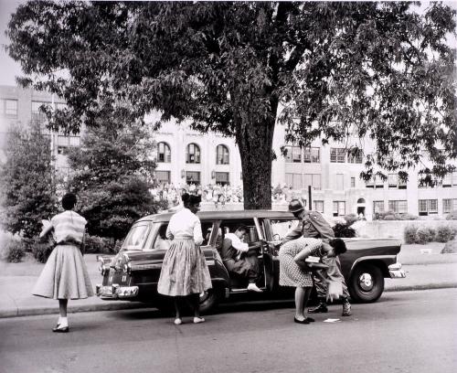Label Text(l to r): Carlotta Walls, Melba Pattillo, Elizabeth Eckford, and Minnie Jean Brown “The first day I was able to enter Central High School, what I felt inside was terrible, wrenching, awful fear. On the car radio I could hear that there was a mob…. So we entered the side of the building, very, very fast. Even as we entered there were people running after us, people tripping other people…. There has never been in my life any stark terror or any fear akin to that.” --Melba Pattillo Beals, one of the Little Rock Nine In 1954 the Supreme Court ruled in the case of Brown v. Board of Education that segregated schools are “inherently unequal” and ordered the desegregation of public schools. Three years later, nine black children in Little Rock, Arkansas, attempted to enroll in Central High School. They were put off initially by legal maneuvers by the governor and by angry mobs. President Dwight D. Eisenhower eventually sent in 1,000 troops to ensure the safe entry of the Little Rock Nine, and the students bravely returned to integrate the school. Ernest Withers stayed in contact with the Little Rock Nine throughout his life.Published Referencescf.: Pictures Tell a Story (Norfolk: Chrysler Museum of Art, 2000) cf.: Let Us March On! Selected Civil Rights photographs of Ernest C. Withers, 1955-1968 (Boston: Massachusetts College of Art, 1992)Exhibition HistoryToledo Museum of Art, People Get Ready: 50 Years of Civil Rights, June 27-September 21, 2014.