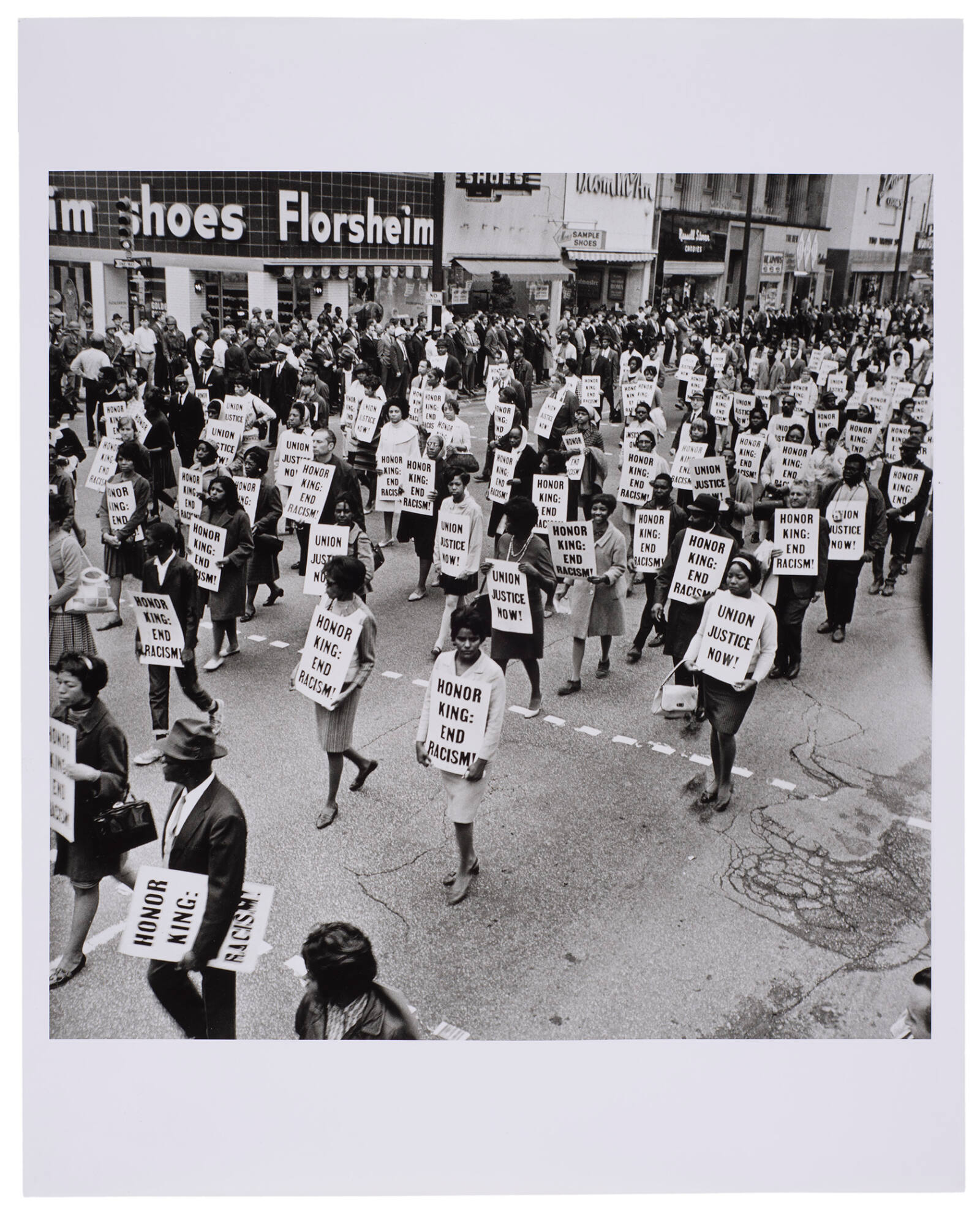 Label TextA silent march of 20,000 through Memphis the day before Martin Luther King’s funeral was led by King’s wife Coretta Scott King and three of their children. In 110 cities across the country, riots broke out in the days following the assassination. Tensions ran high in Memphis, too—the National Guard, armed with rifles and tanks, lined the streets during the march while helicopters circled overhead.Published Referencescf.: Pictures Tell a Story, Norfolk: Chrysler Museum of Art, 2000.