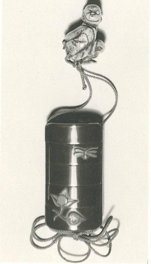 Inro: dragonflies and flowers; Ojime= is missing; Netsuke: crouching boy wearing a mask