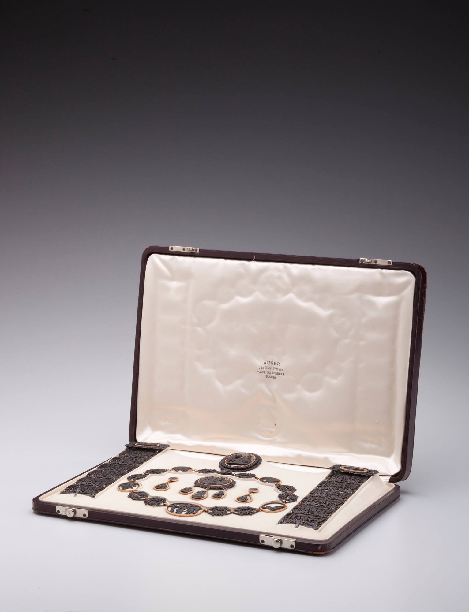 DescriptionThe matching set of jewelry consists of two matching bracelets, a waist buckle, a brooch, a necklace and a pair of earrings with detachable drops. It is assembled from cast iron openwork links with stylized floral decoration and faux cameos consisting of cast iron figural reliefs backed by cream-colored variegated stone (?) and set in gold beadwork frames.