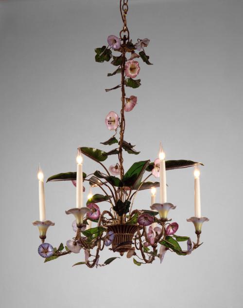 Label TextMade in the mid-1800s, this morning glory chandelier recalls Rococo floral chandeliers made with porcelain or tôle (painted tin) blossoms that were fashionable in the private quarters of French-style 18th-century chateaux in Europe. Since the morning glory flower blooms and dies within a single day, it came to signify love, affection, or mortality in the Victorian era. A drawing of a chandelier covered in morning glory vines from about 1850 by Ludwig Lobmeyr, then owner of the venerable chandelier maker J. & L. Lobmeyr in Vienna, remains in the company archives. The design was most likely created in preparation for Lobmeyr’s participation in the Crystal Palace Exhibition in London in 1851—the first World’s Fair. Queen Victoria purchased a large chandelier of this type at the fair for Osborne House, her new summer retreat on the Isle of Wight, and consequently such charming chandeliers became exceedingly popular. A similar chandelier, now lost, was commissioned by the ill-fated Emperor Maximilian I of Mexico (who was executed in1867); another is still at Pena National Palace in Sintra, Portugal.Published ReferencesMallett Antiques, Ltd., The Lighting Sale, 2005, pp. 42-45.Comparative ReferencesSee also Peter Rath et al., Helles Glas und klares Licht, 1998, p. 41, no. 18.3rd to 1st century BCE